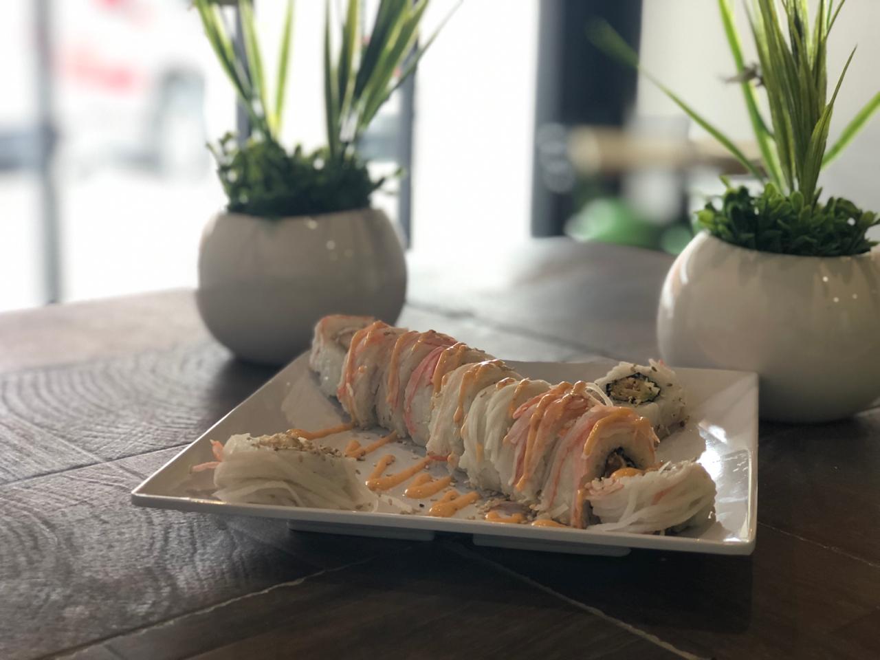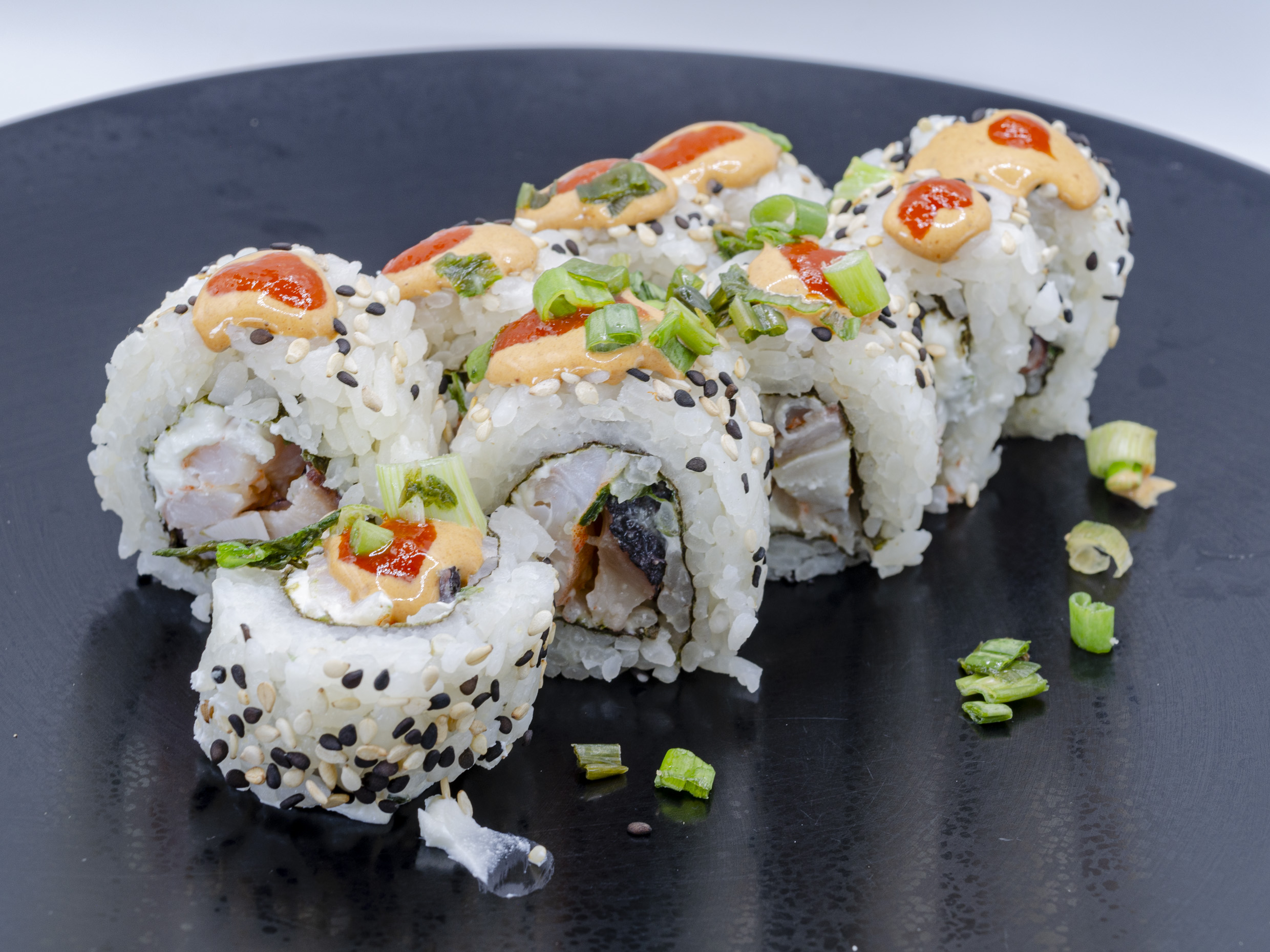 Camarón, pulpo, queso crema, cebollín, cubierto de ajonjolí, bañado en chipotle y tampico.