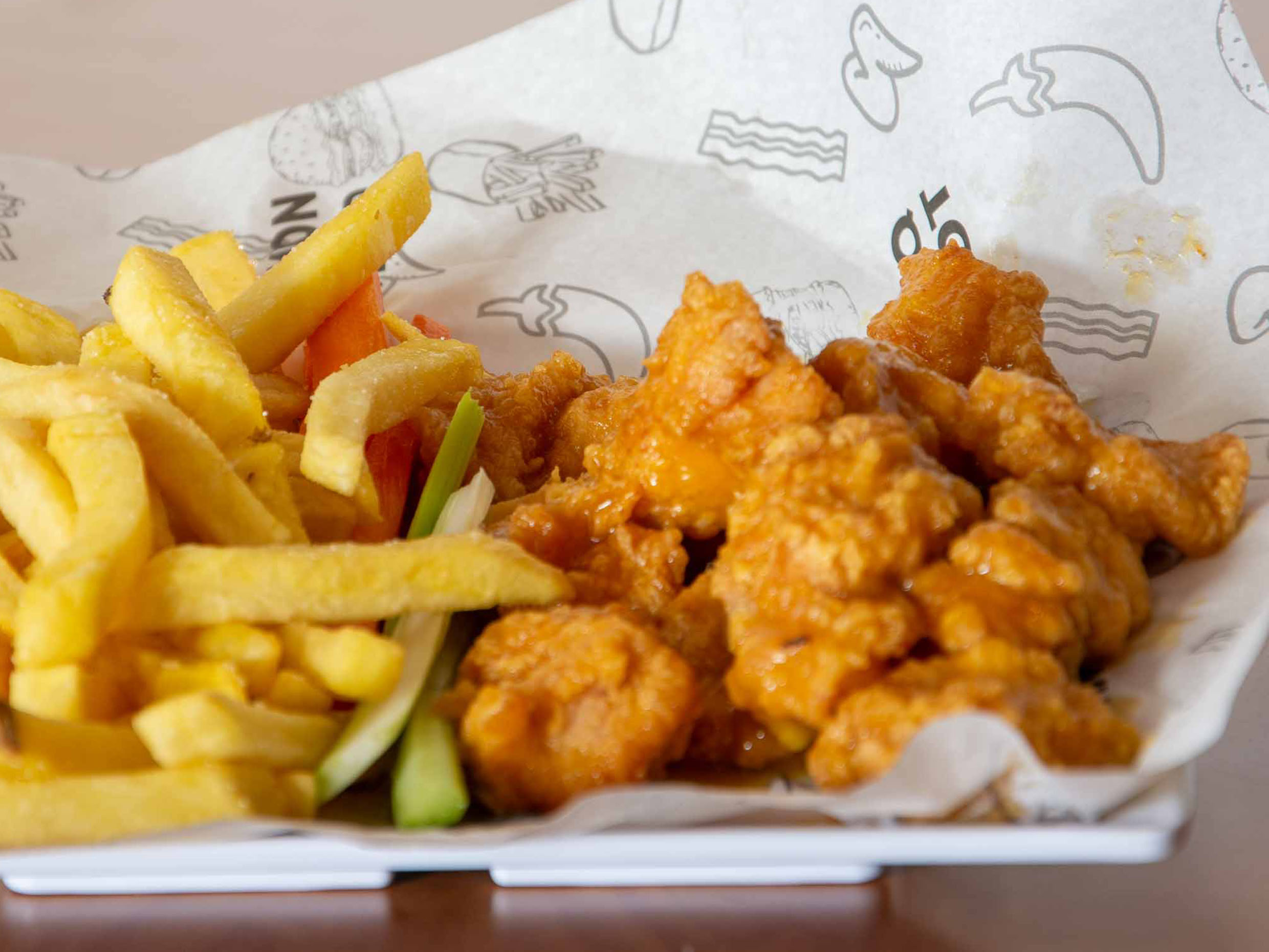 200 Gramos de boneless en tu salsa favorita, acompañados con papas, apio, zanahoria y aderezo ranch