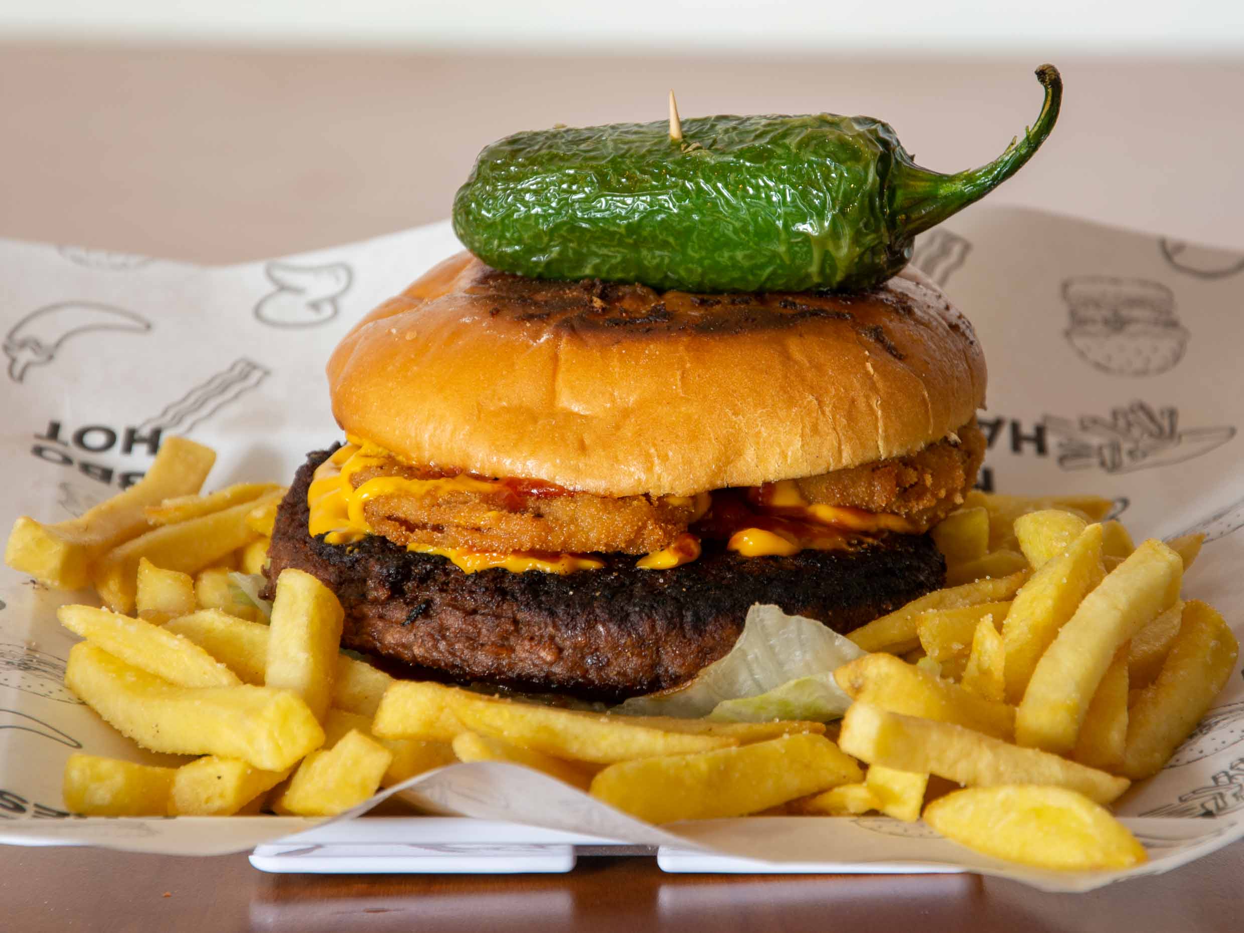 Jugosa Pechuga de Pollo empanizada, bañada en salsa bufalo, queso derretido y aderezho ranch, encima de una carne 100% res, dentro de un pan artesanal acompañada con papas fritas