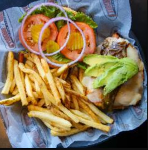 227g De pechuga de pollo a la parrilla sazonada a la perfección cubierta de aguacate fresco y chile california. Incluye papas fritas.