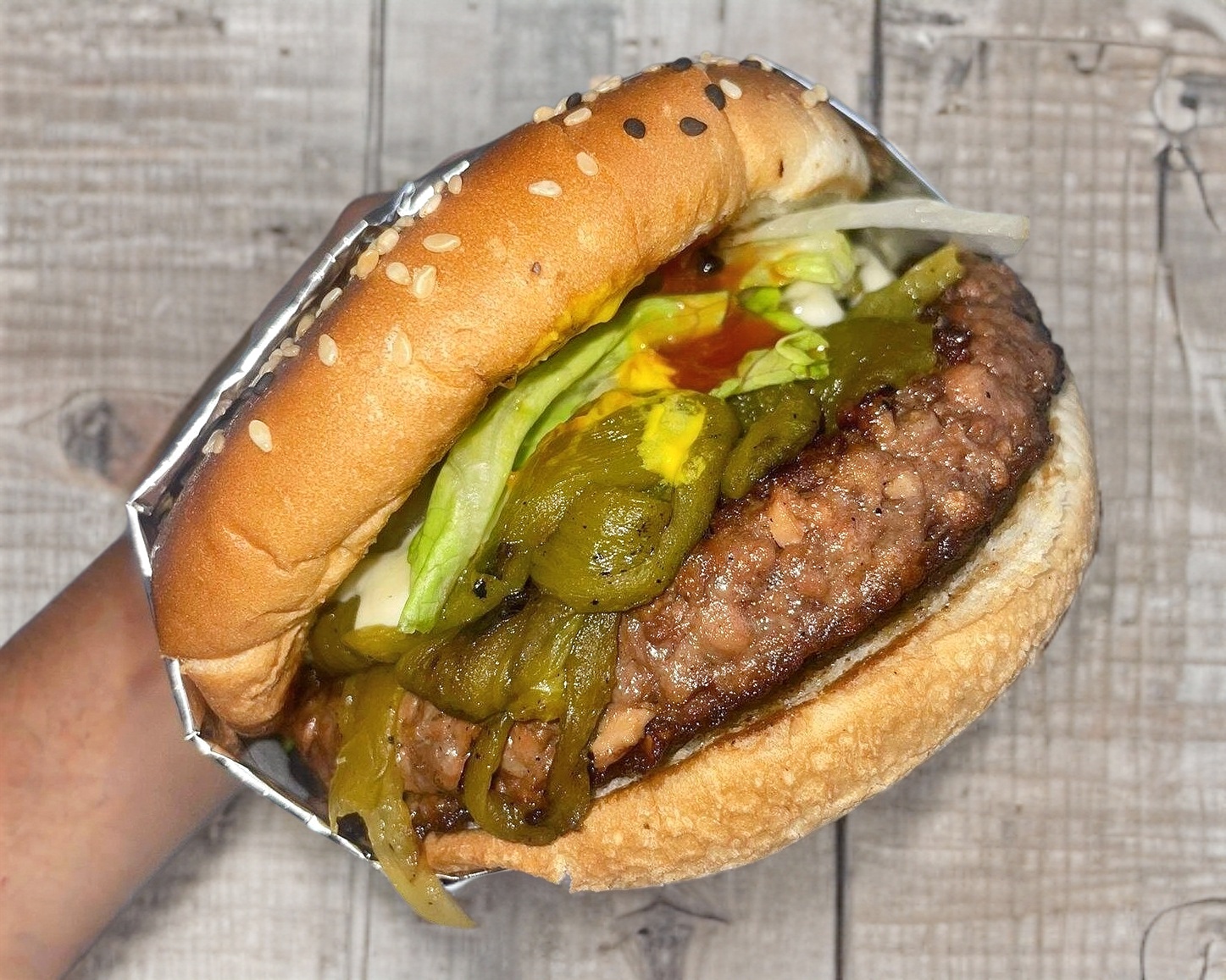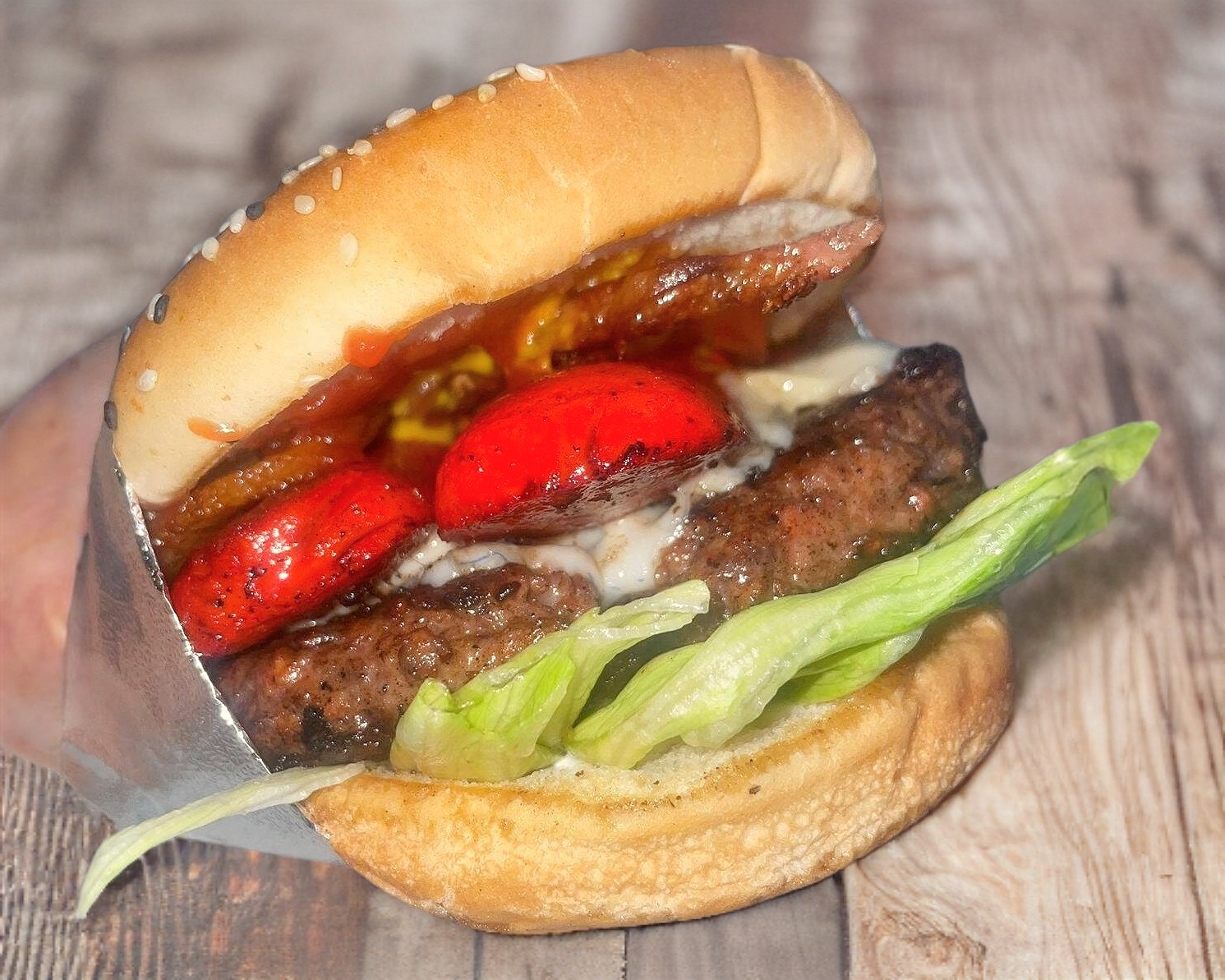 220g de carne de res acompañada de queso amarillo, vegetales, aderezos y papas fritas.
