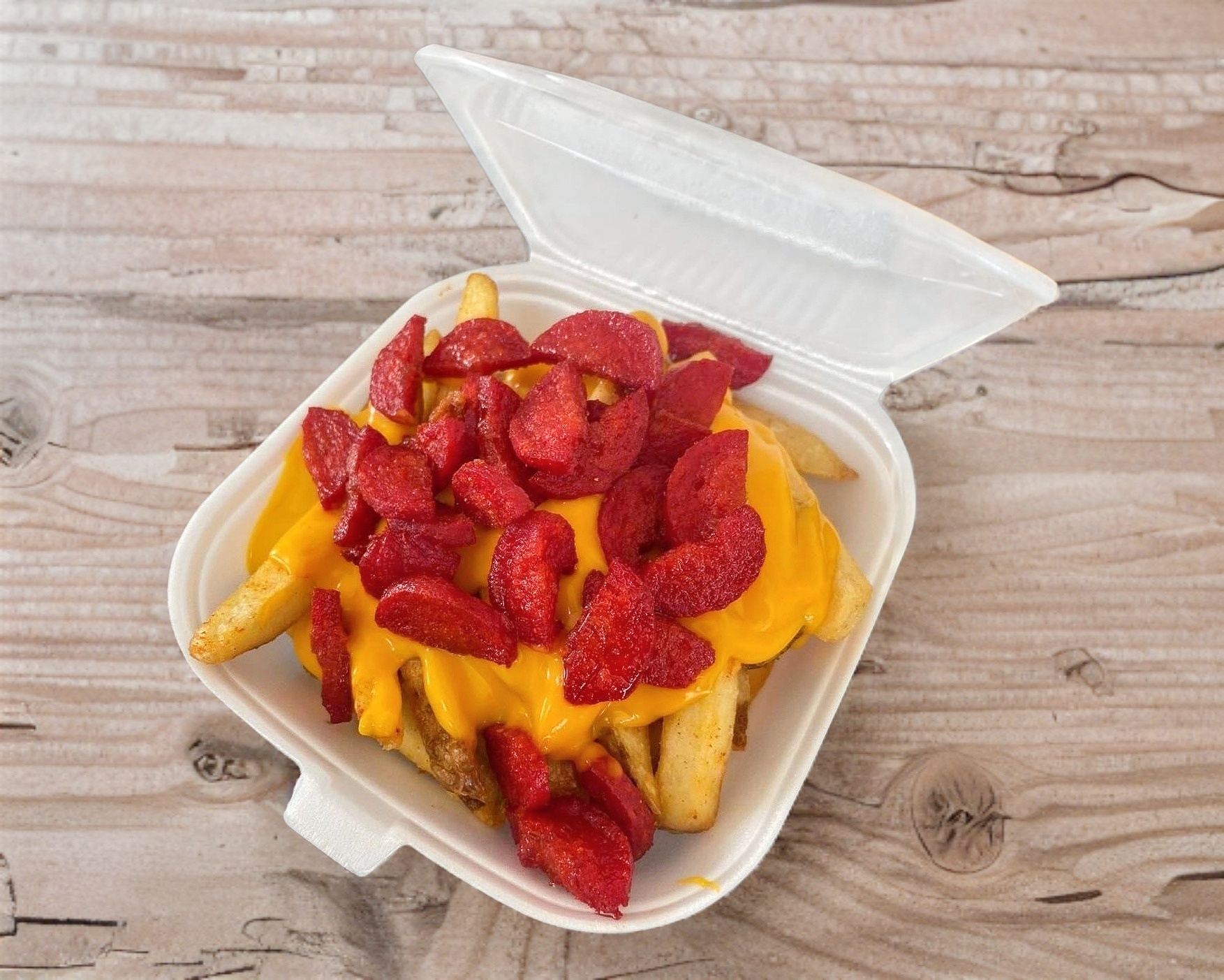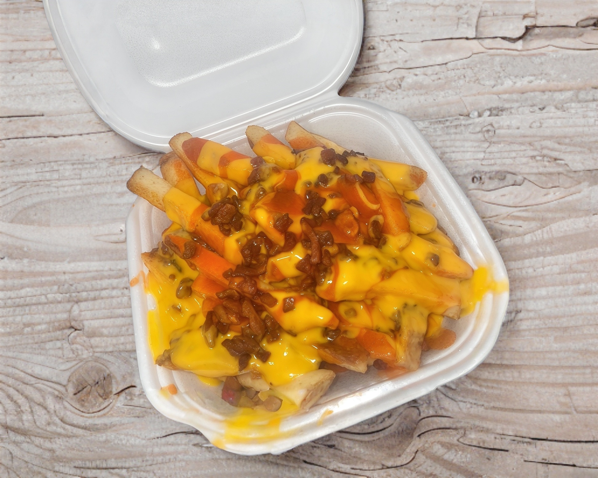Papas fritas bañadas en salsa bufalo con queso amarillo y tocino