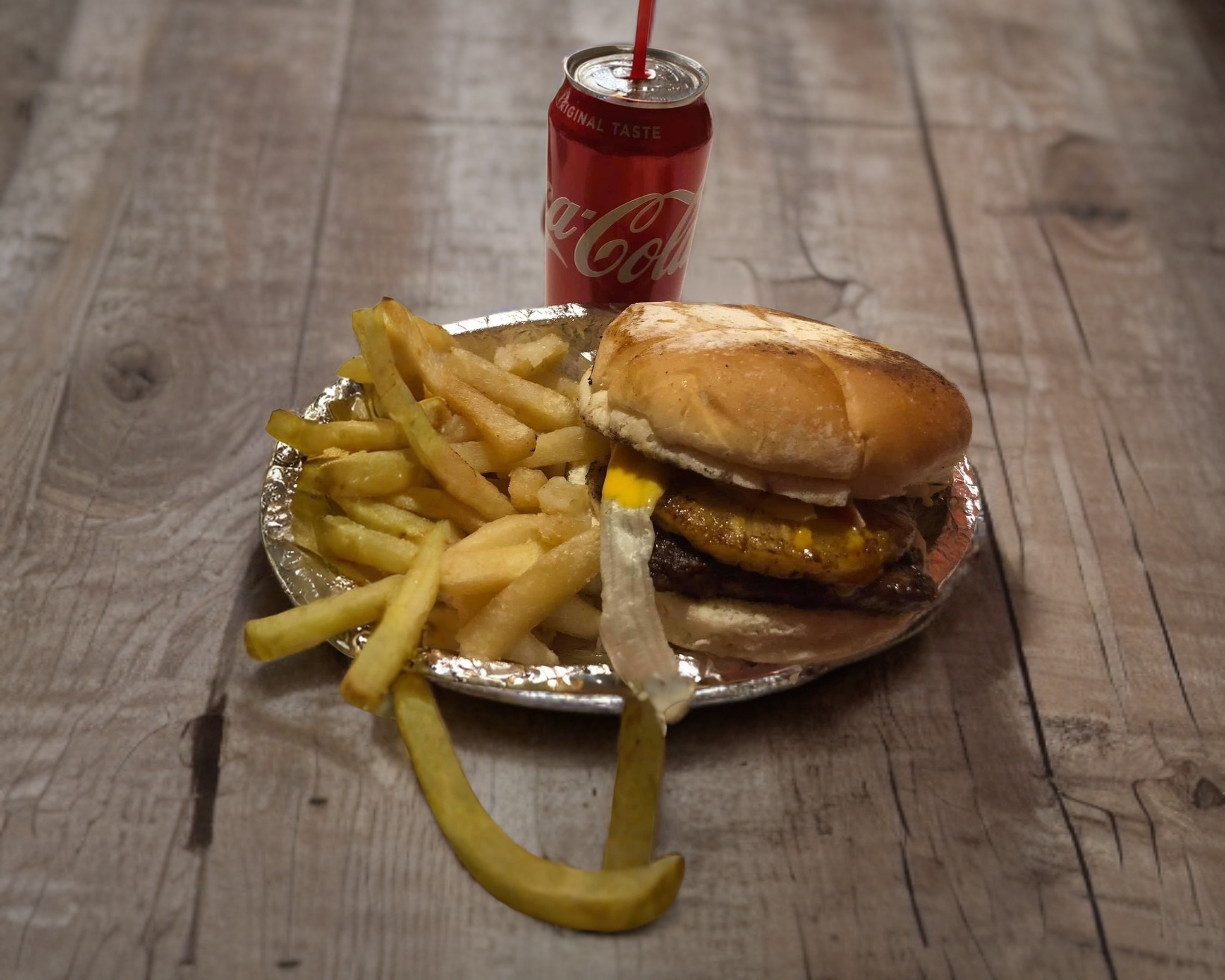 220g de carne de res acompañada de una rebanada de piña, queso amarilla, vegetales, aderezos y papas fritas.