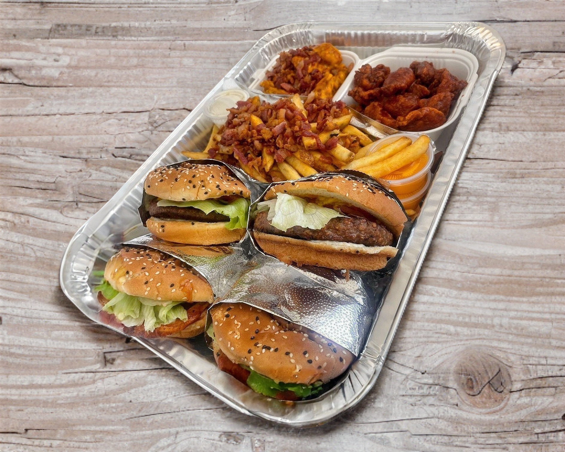 Dos hamburguesas de carne de res, dos de pechuga de pollo bañada en alguna salsa,900g de boneless,papas fritas,dos aderezos ranch y queso amarillo