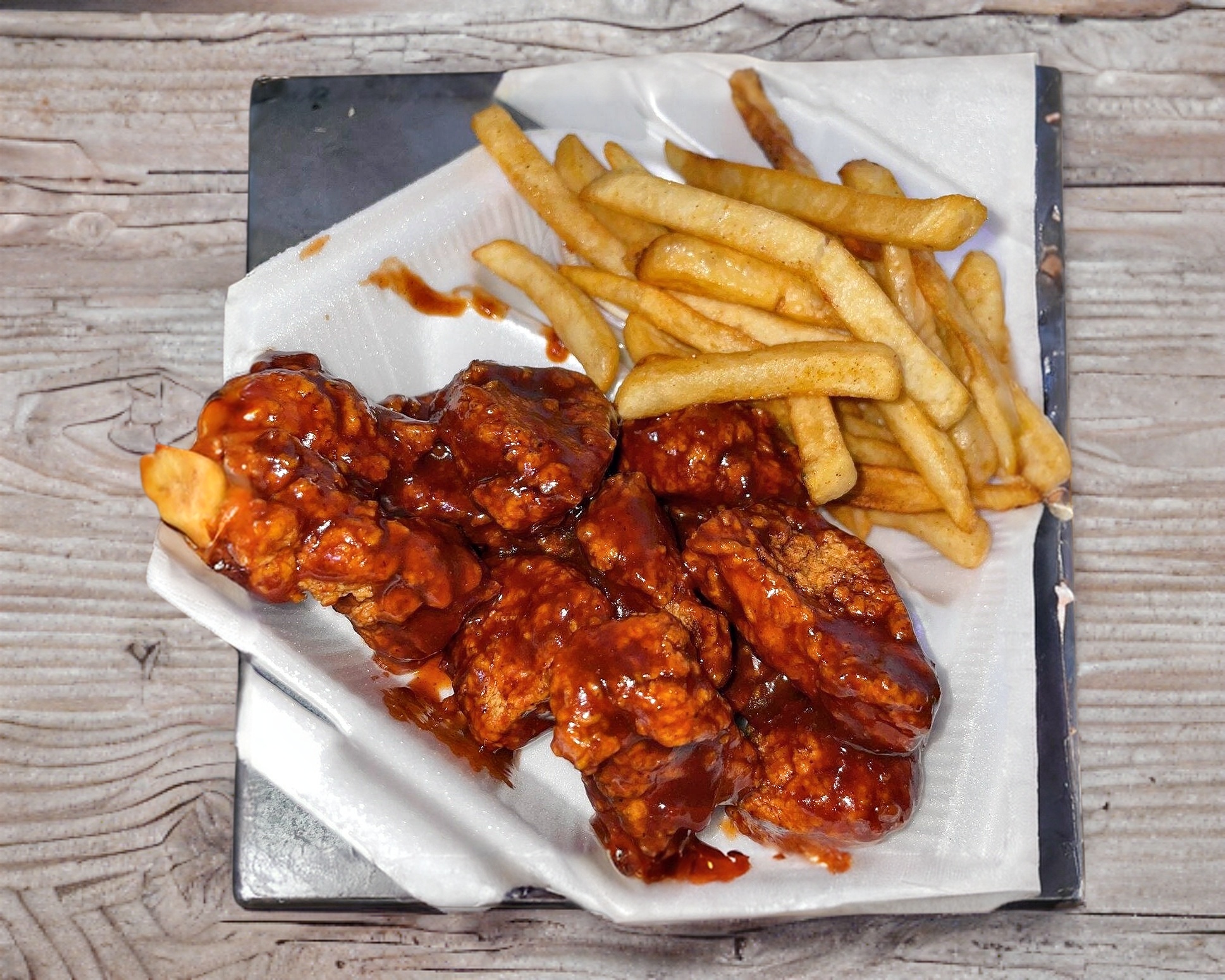 270g de pechuga de pollo bañados en la salsa de su elección, aderezo ranch y papas fritas.
