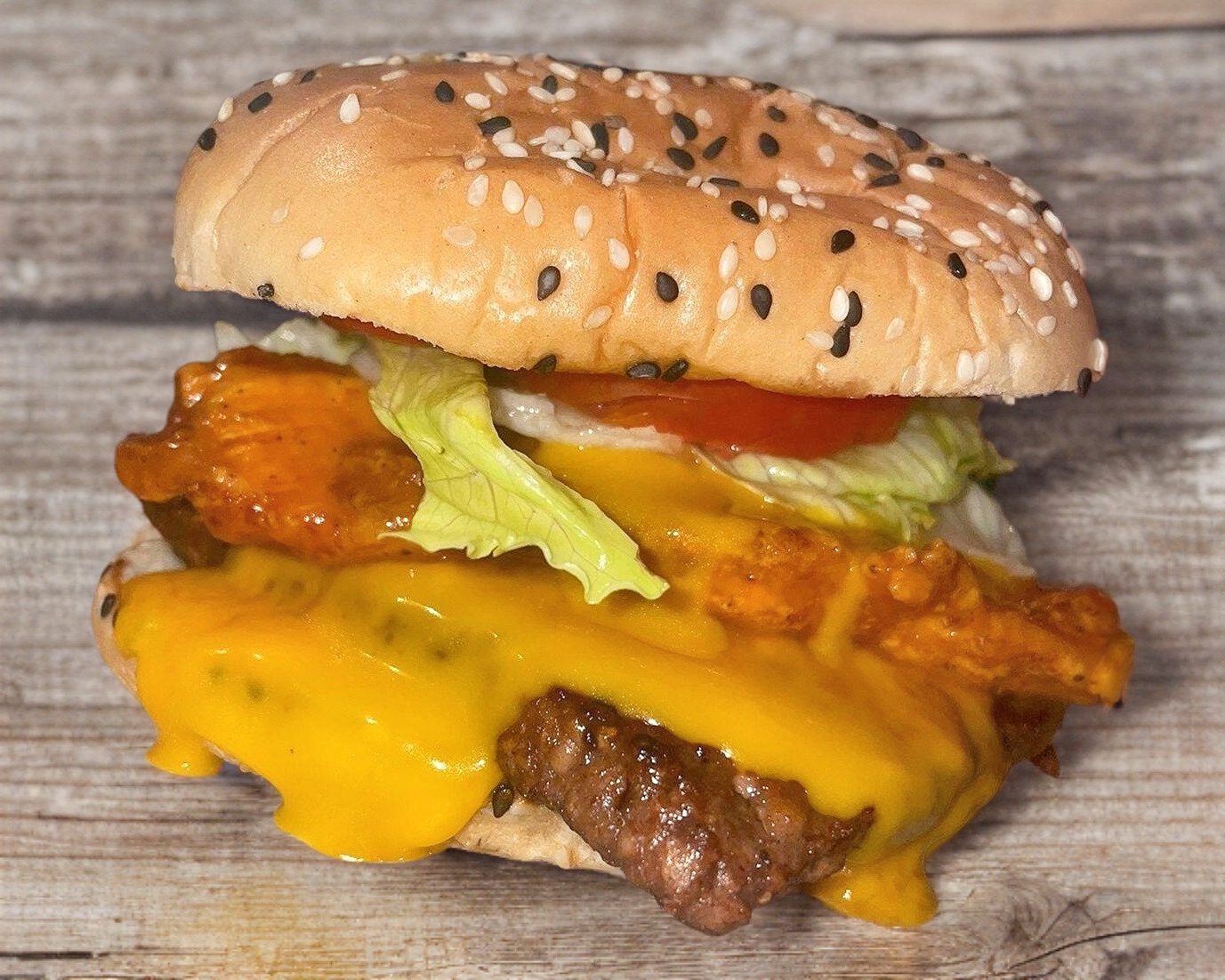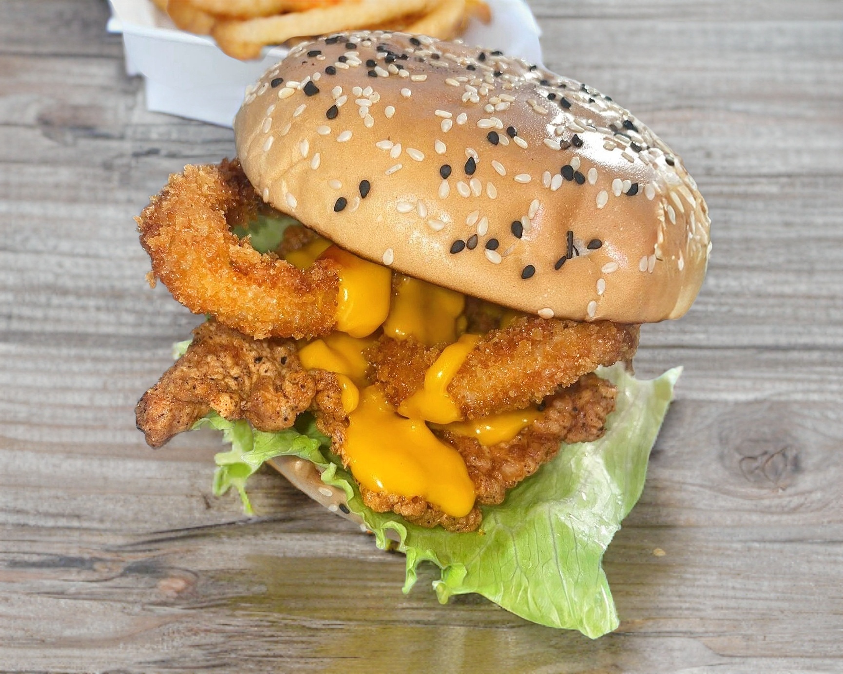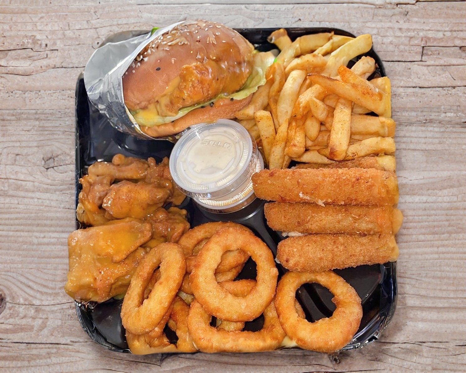 Hamburguesa de pechuga, una orden de alitas o boneless 10 aro de cebolla papas fritas y 6 dedos de queso