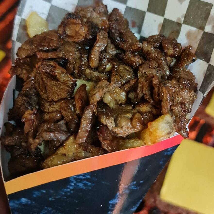 1 Cono de papas fritas con queso y carne asada bañada en cualquier salsa.