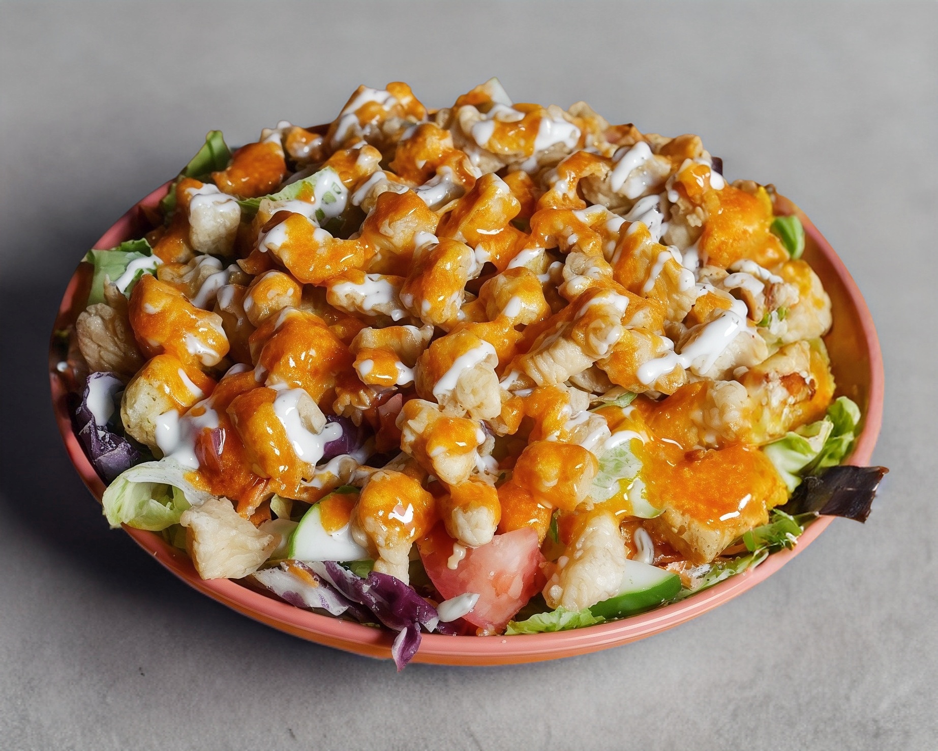 Deliciosas papas bañadas en queso con poppers de pollo bañados en su salsa de preferencia con aderezo