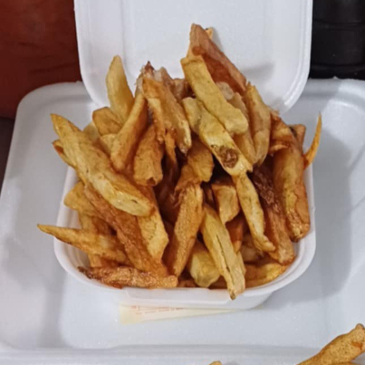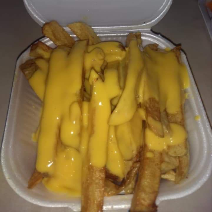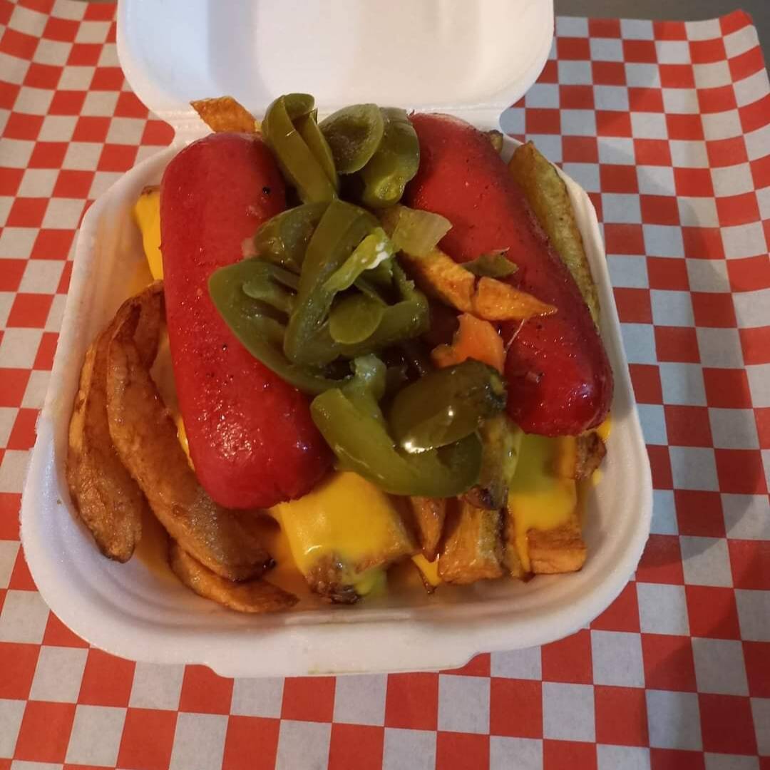 PAPAS FRITAS, QUESO CHEDDAR, SALCHICHA ASADA, CURTIDOS