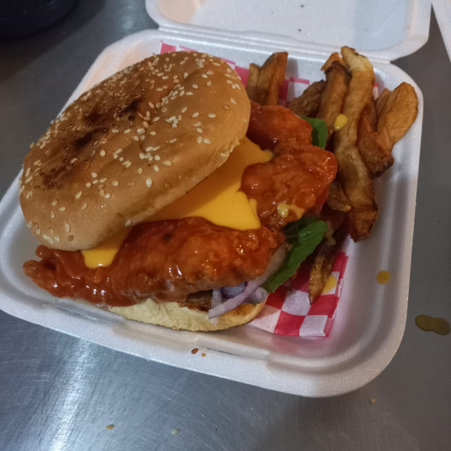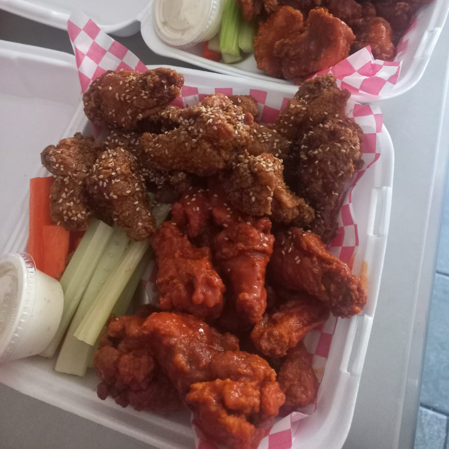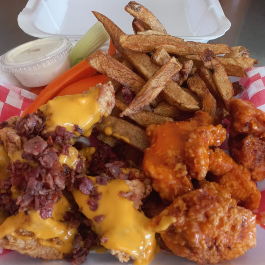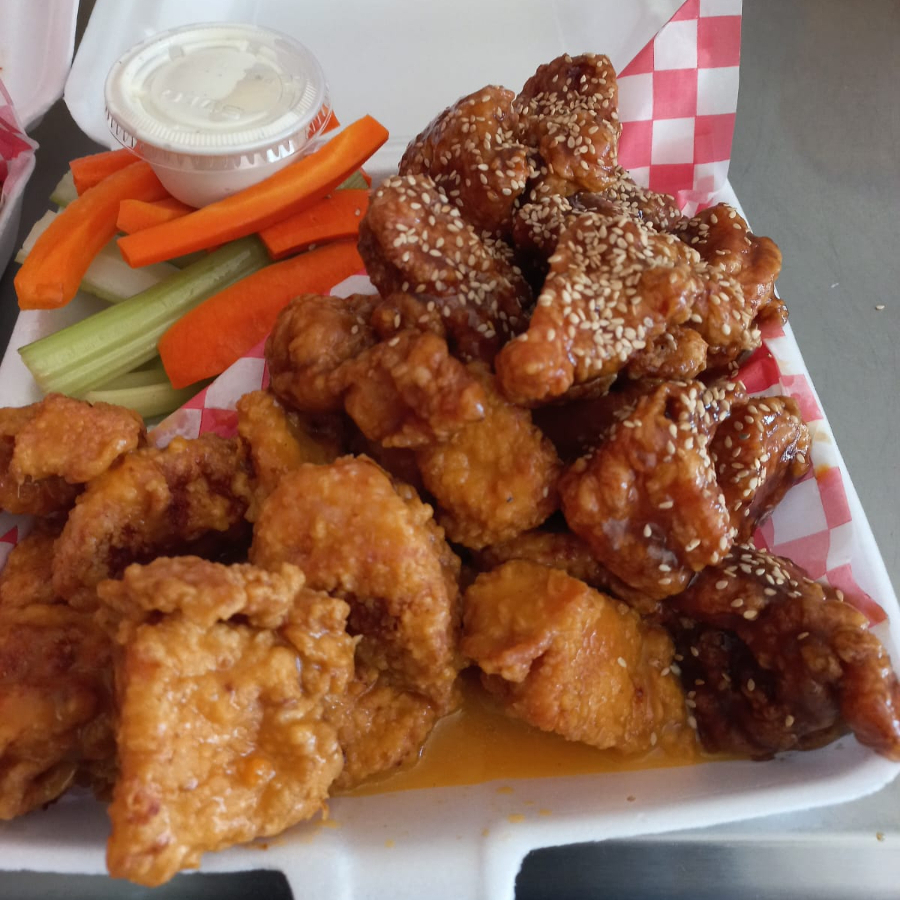 BAÑADA EN CUALQUIERA DE NUESTRAS SALSAS E INCLUYE PAPAS, VERDURAS Y RANCH