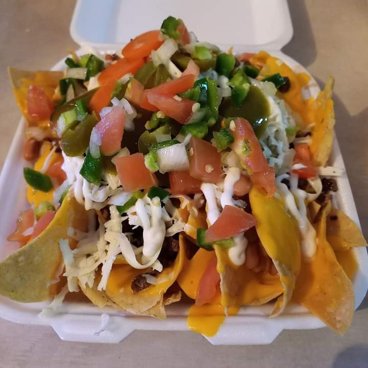 TOTOPOS, QUESO CHEDDAR, FRIJOLES, CARNE SIRLOIN, QUESO BLANCO, PICO DE GALLO, CURTIDOS Y CREMA