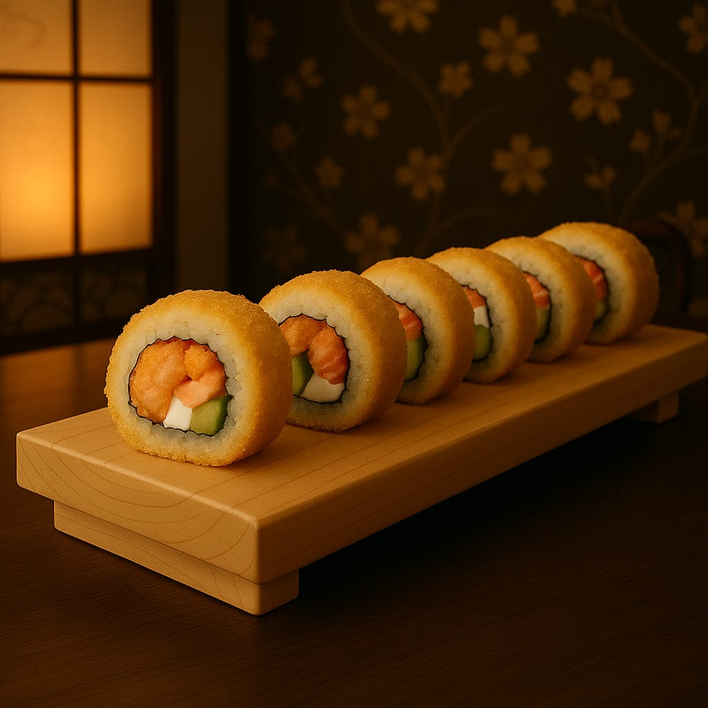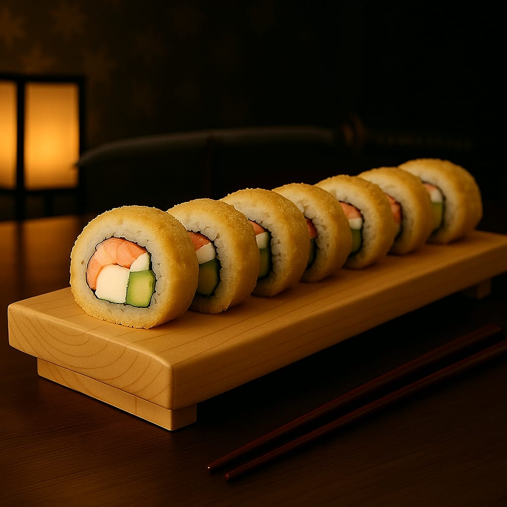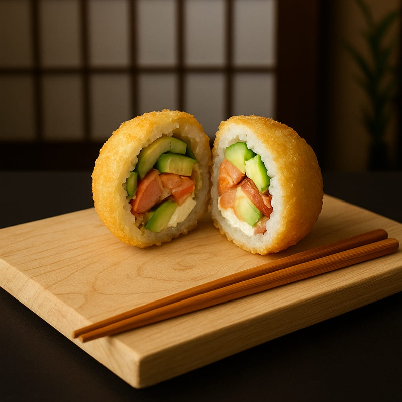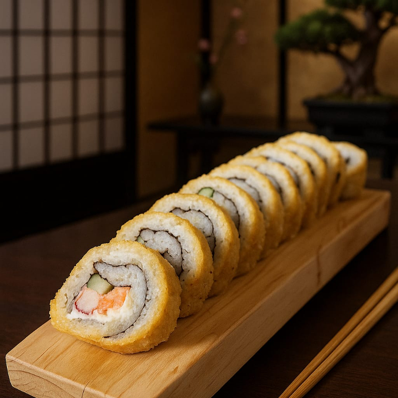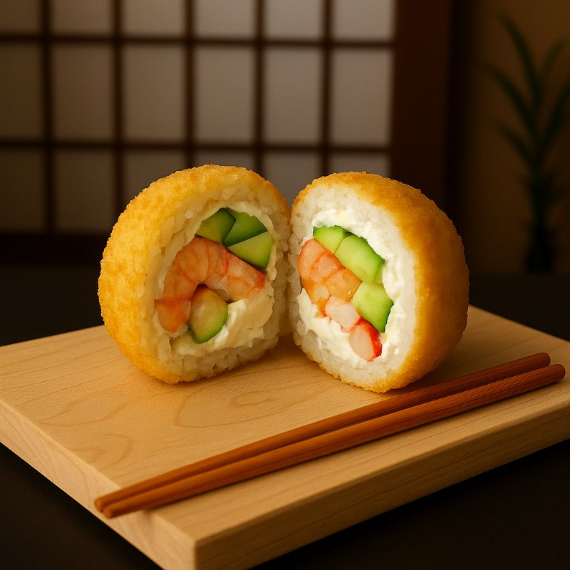 (Camarones empanizados, tocino, aguacate, pepino, queso crema)