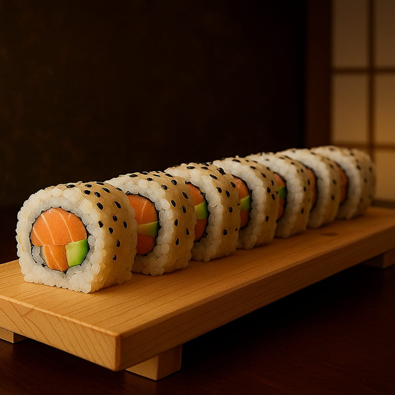 (Pepino, aguacate, salmón, camarón surimi, queso crema)