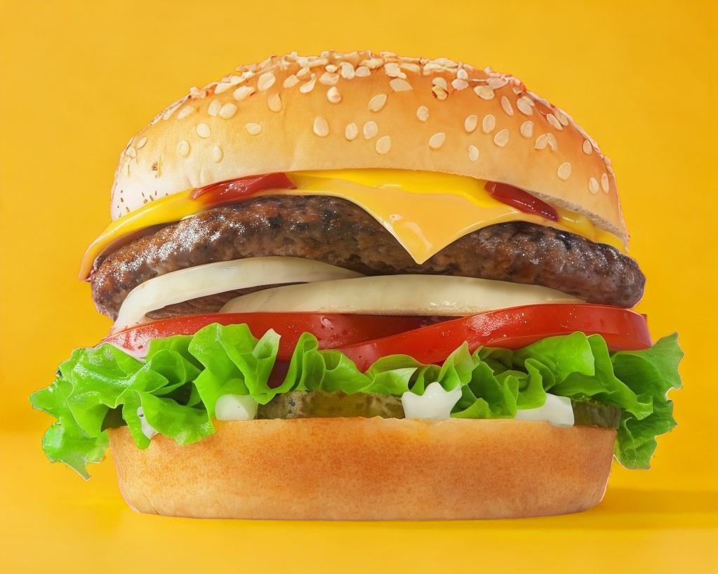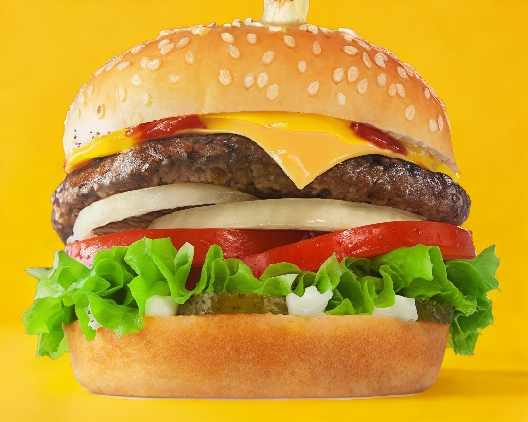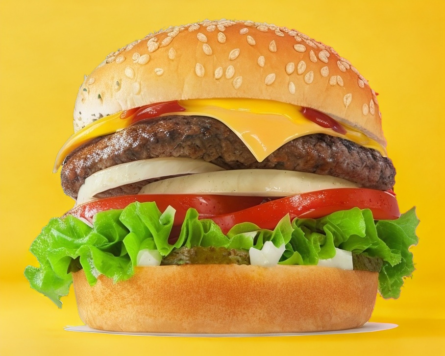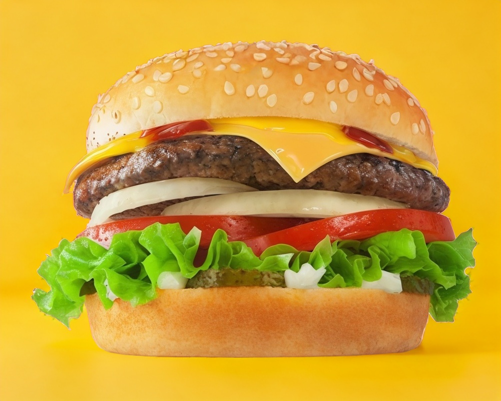 Doble carne, queso amarillo, tomate,cebolla asada, pepinillos,lechuga,mostaza,catsup y mayonesa