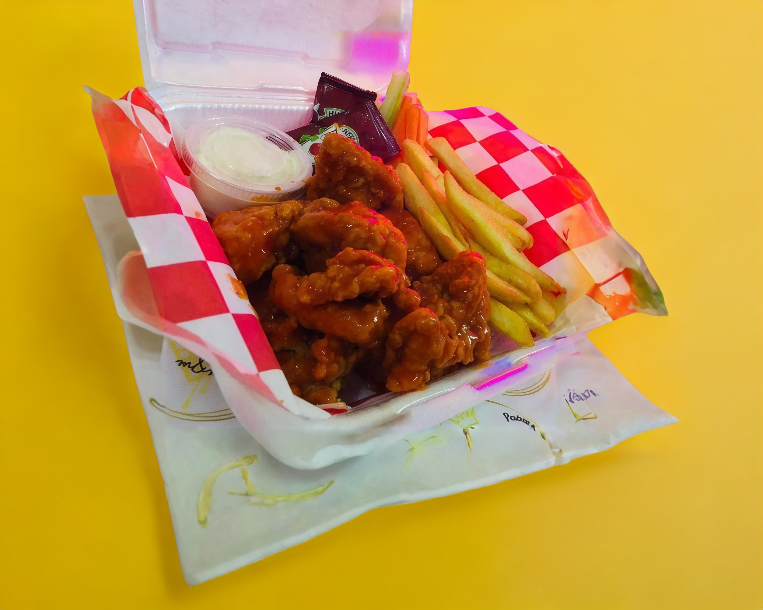 Orden de alitas con papas fritas, ranch,catsup,apio y zanahoria