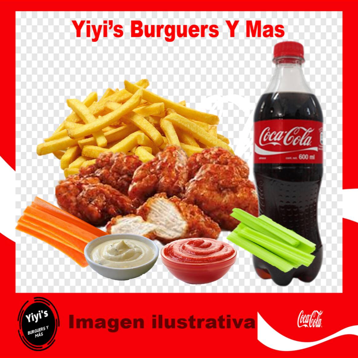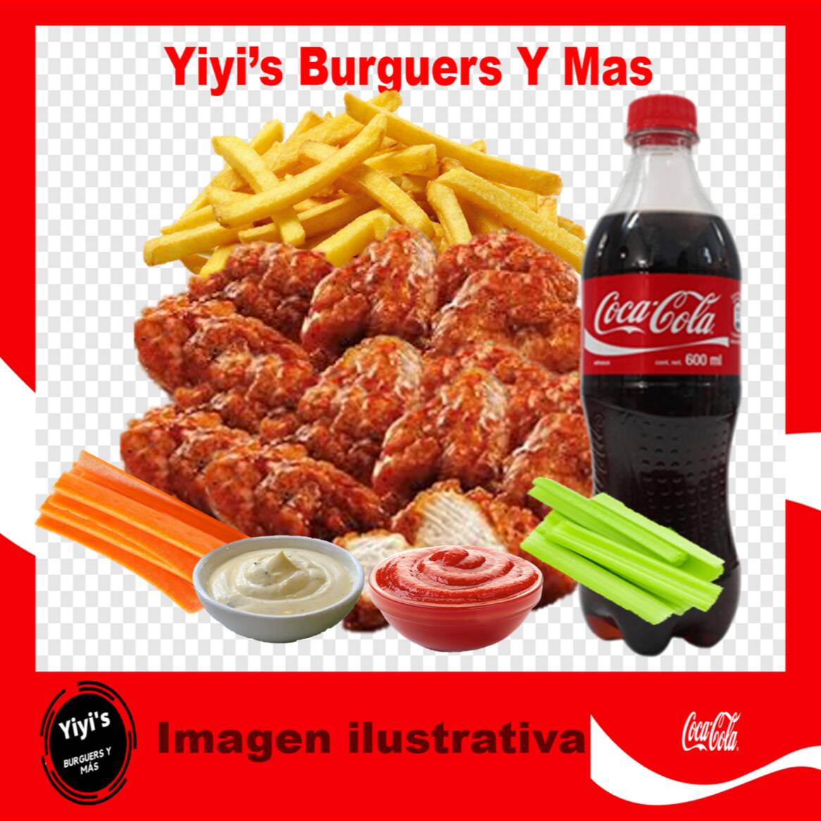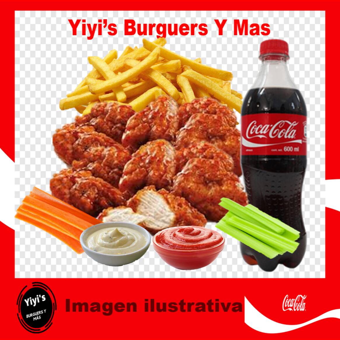 500g de boneless 100% pechuna, salsa a escoger, salsa ranch, zanahoria, apio y una porcion de papas con catsup y refresco de 600ml