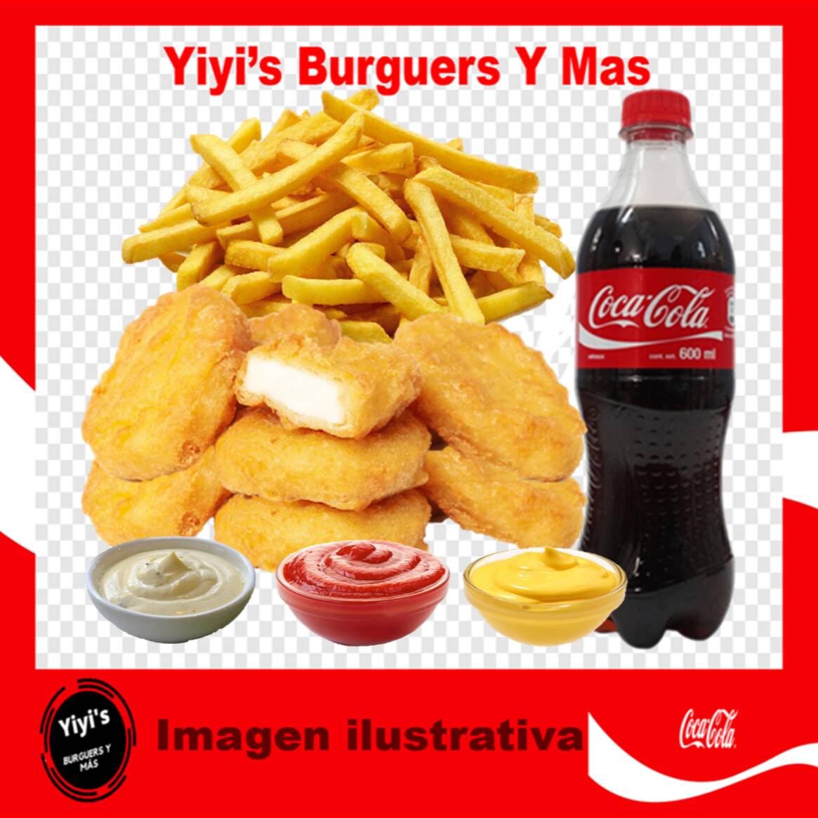 6 Piezas de nuggets de pollo, papas fritas, aderezo ranch, queso para nachos y cátsup mas refresco de 600 ml o a tu gusto