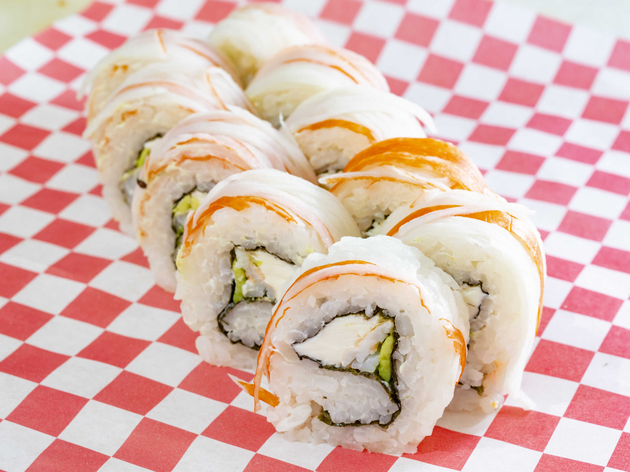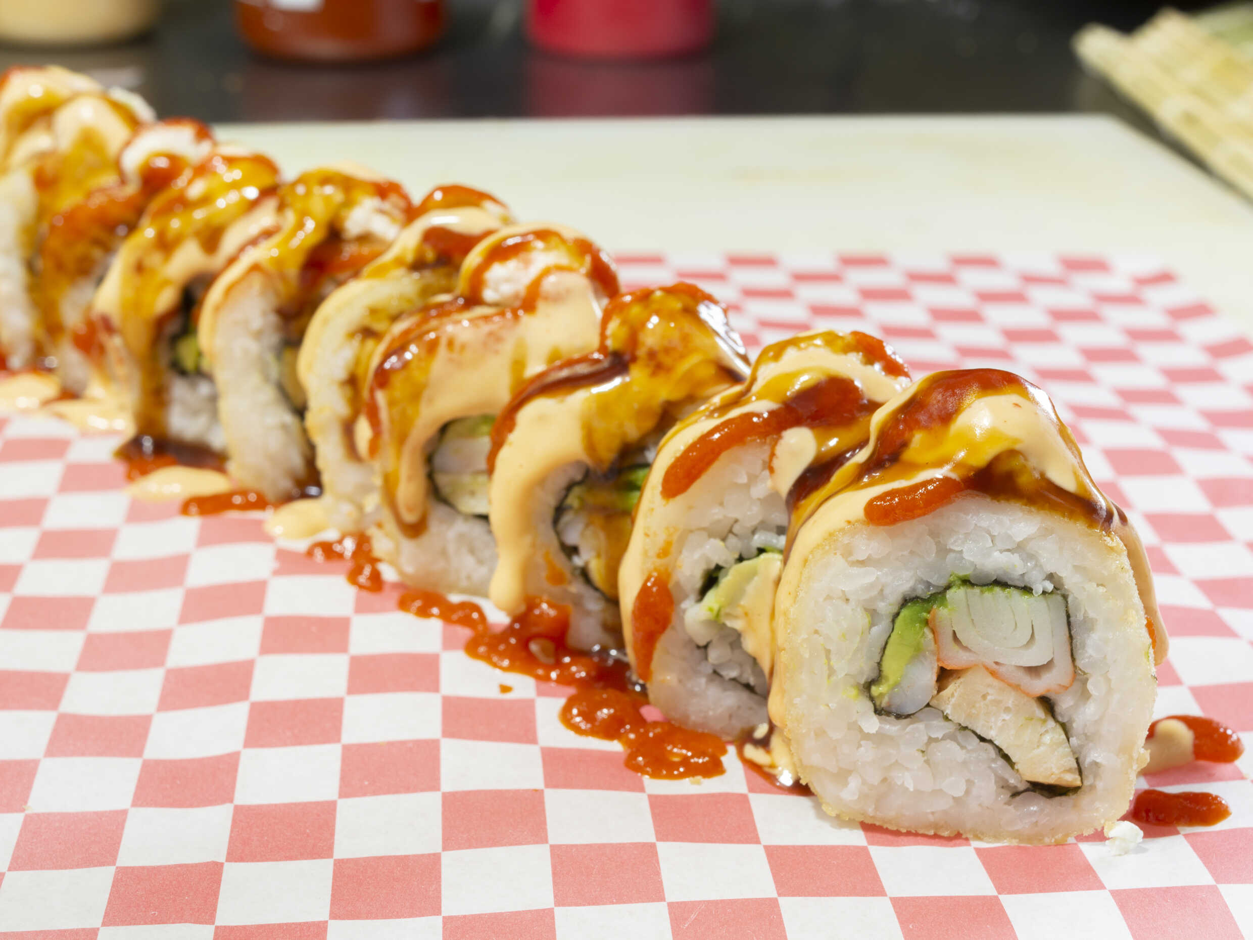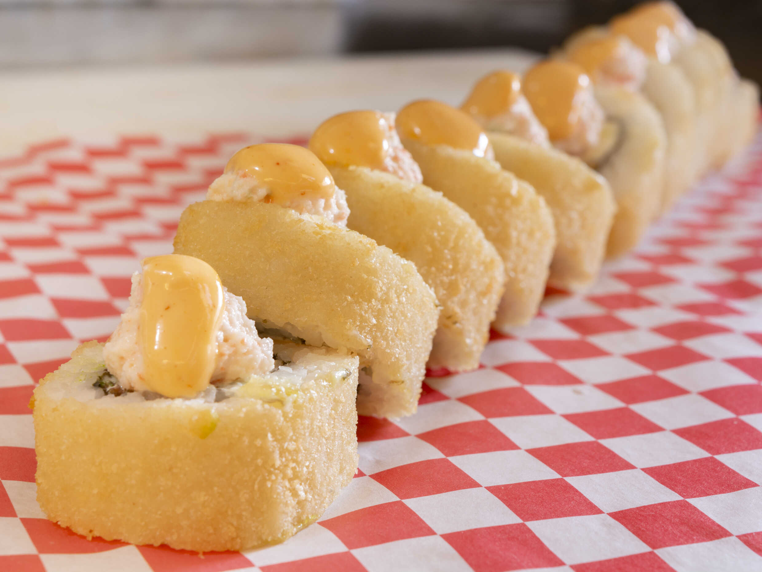 Queso, aguacate, camarón capeado toreados cubierto de salmón con sirasha arriba