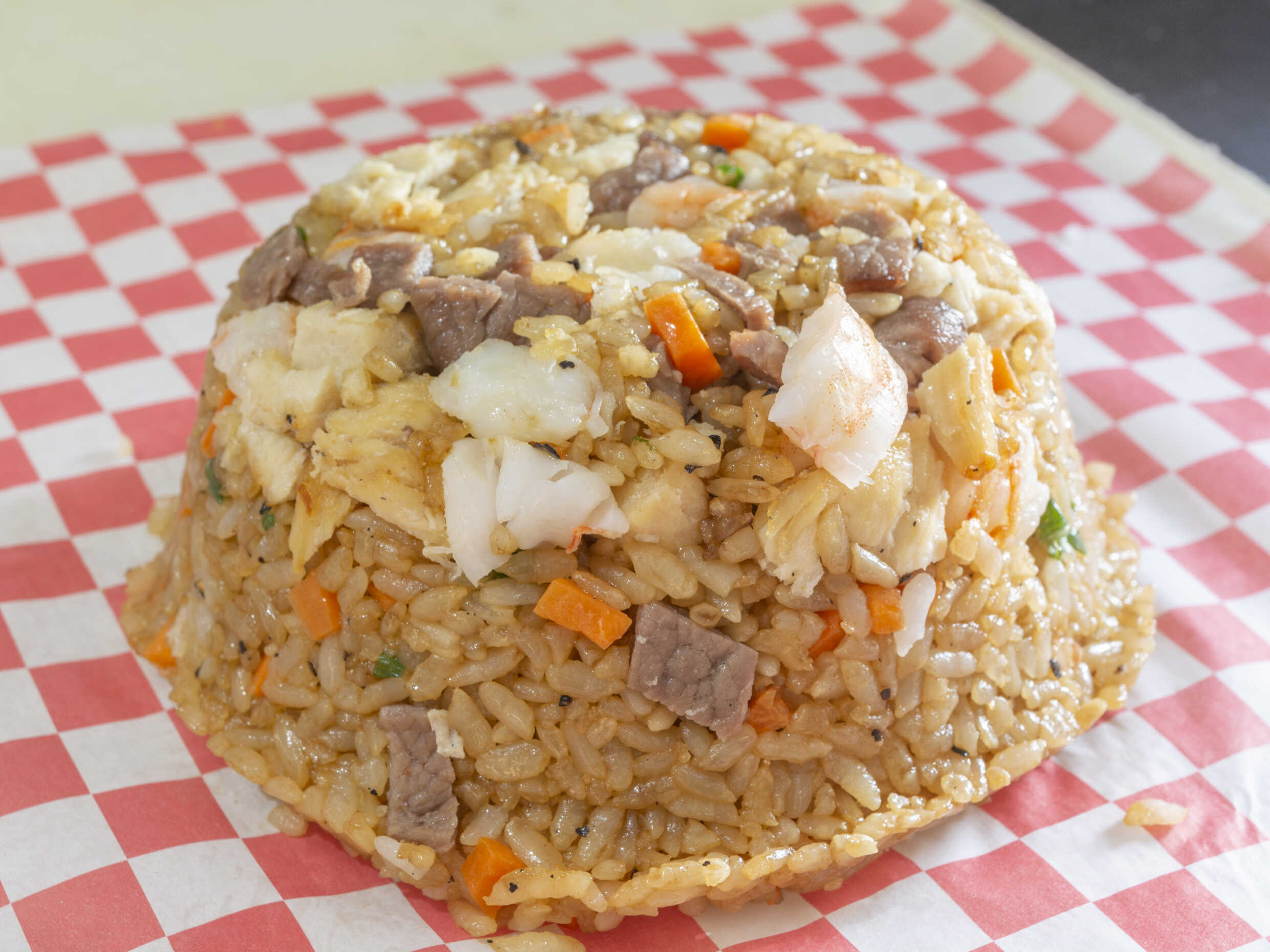 Queso aguacate,pollo,carne y camarón bañado en salsa de anguila y ajonjolí