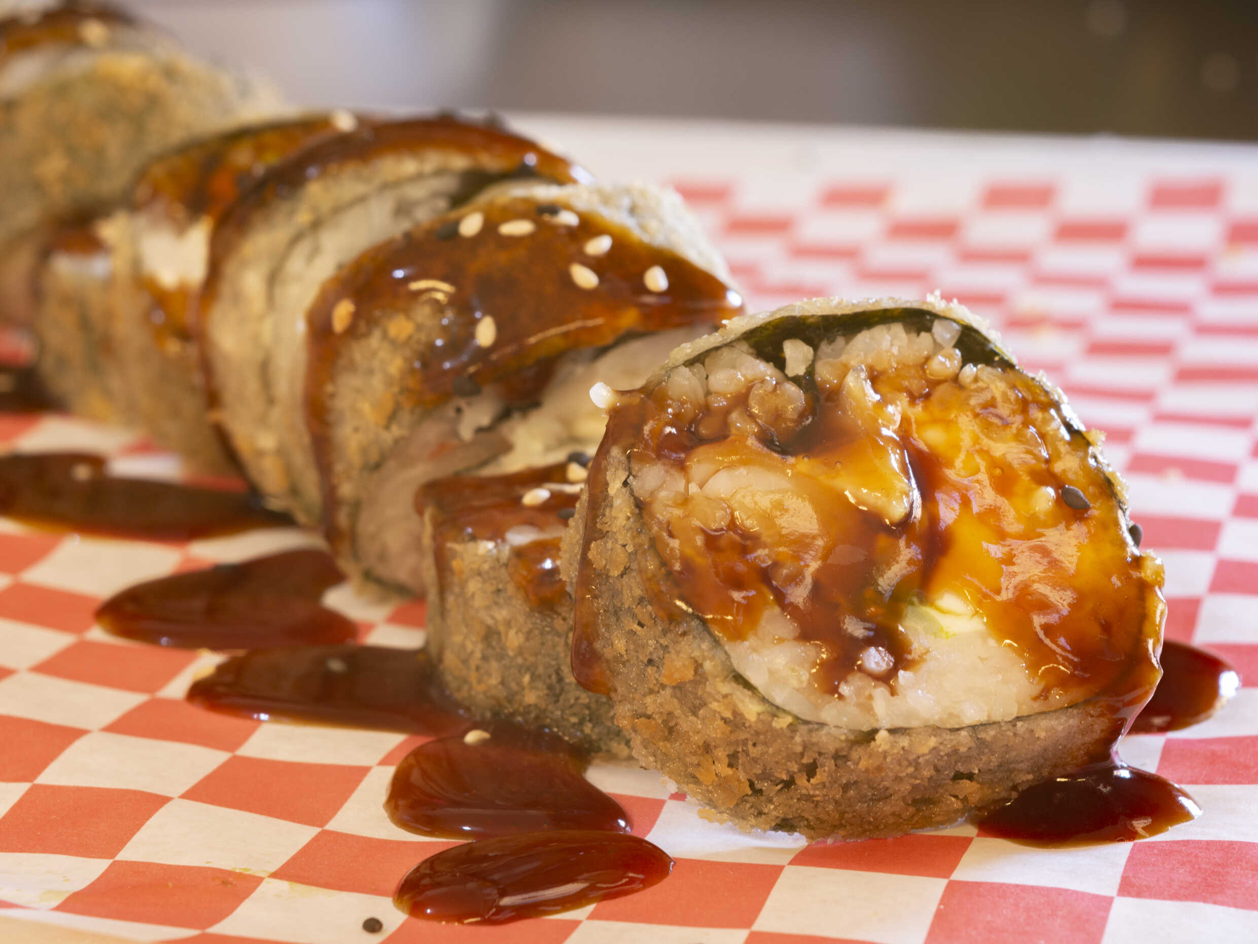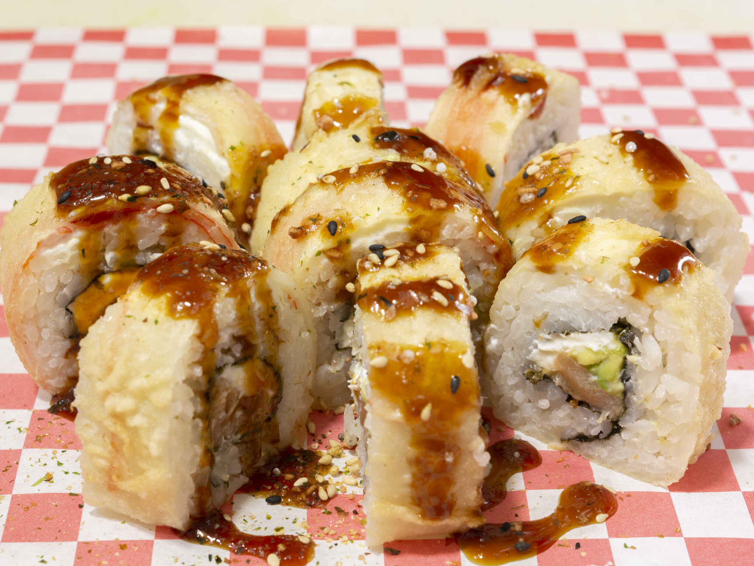 Bola empanizada con queso Philadelfia, queso, aguacate, surimi y camaron, bañada con salsa de anguila con ajonjoli