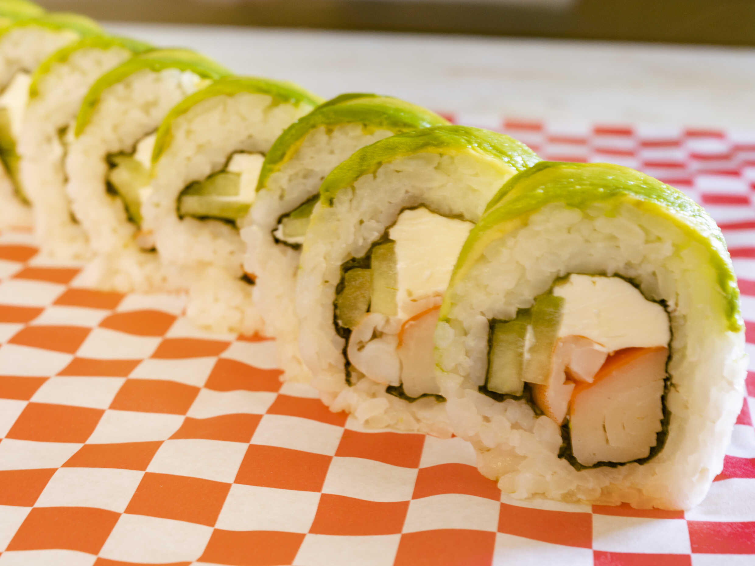 Alga por fuera, queso aguacate surimi y camarón bañado en salsa de anguila