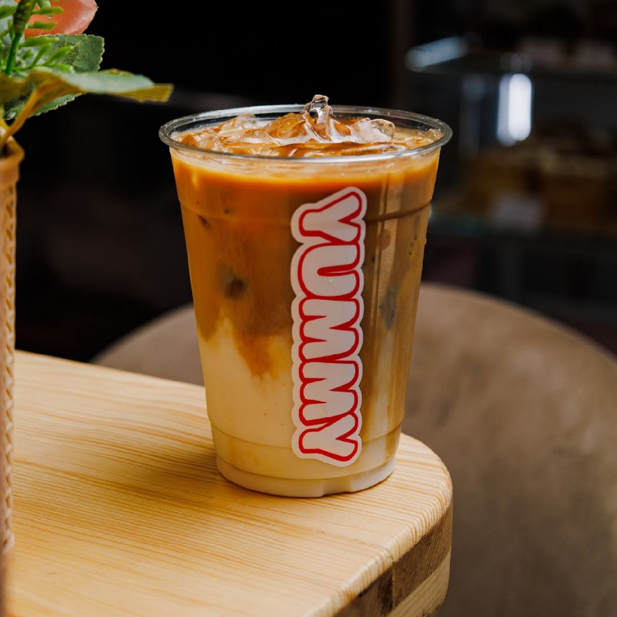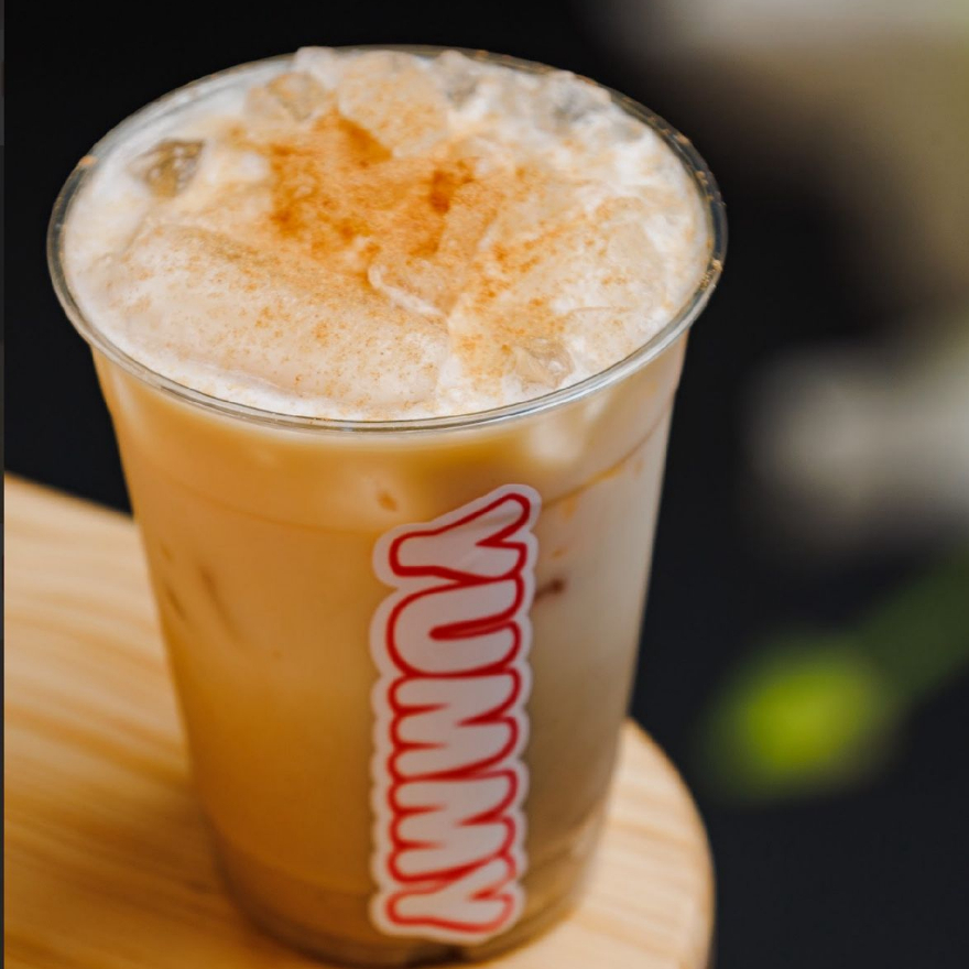 Bebida refrescante sabor mango con crema de coco y trozos de mango.