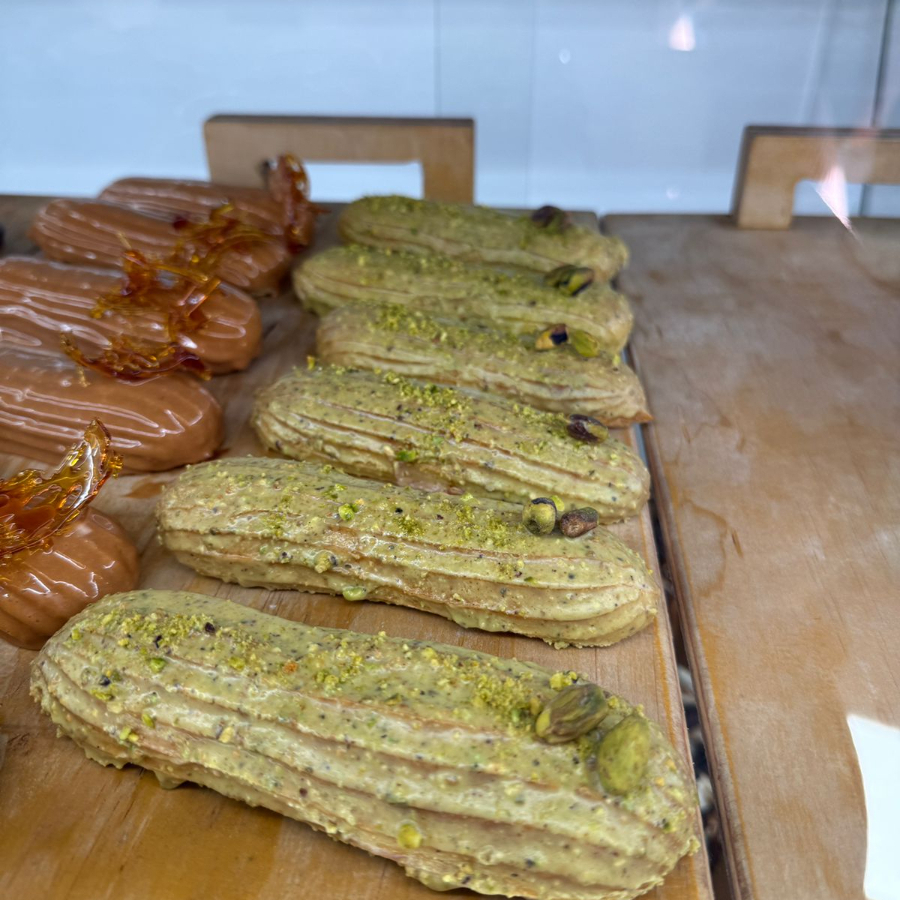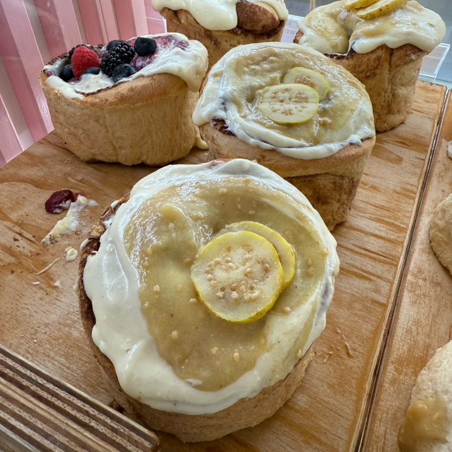 Pan suave con el relleno clásico de canela con azúcar mascabado y una crema de pistache..