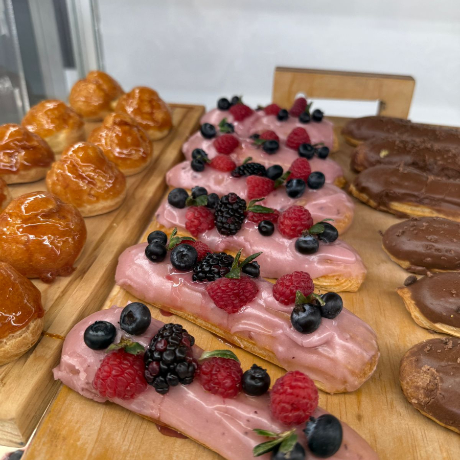 Croissant relleno de crema de frutos rojos, decorado con frutos rojos frescos.