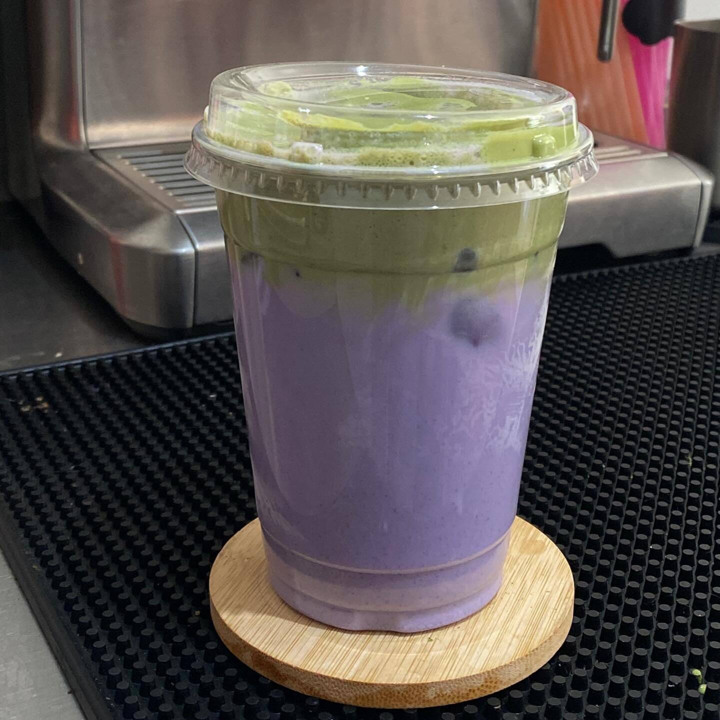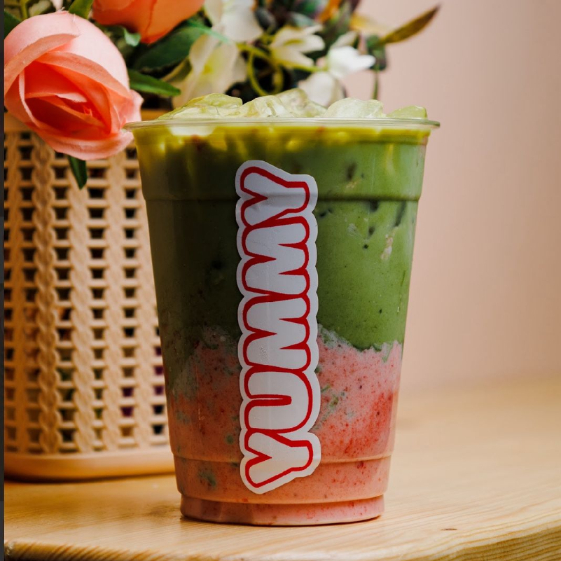 Nuestro matcha latte con una espuma dulce y suave sabor fresa.
