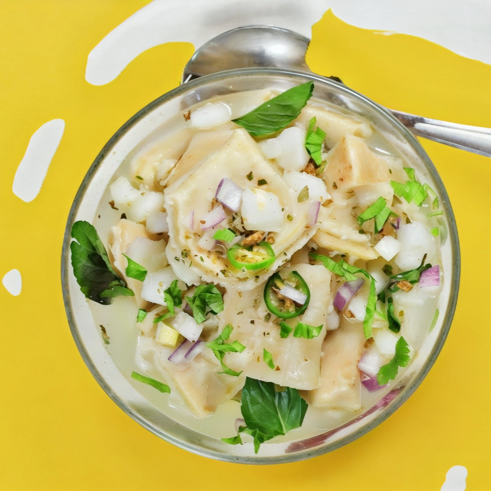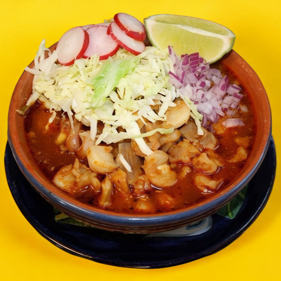 2 Tostadas con lechuga, tomate, cebolla morada, aguacate y queso rallado. Incluye su consomé, Salsa y Crema.