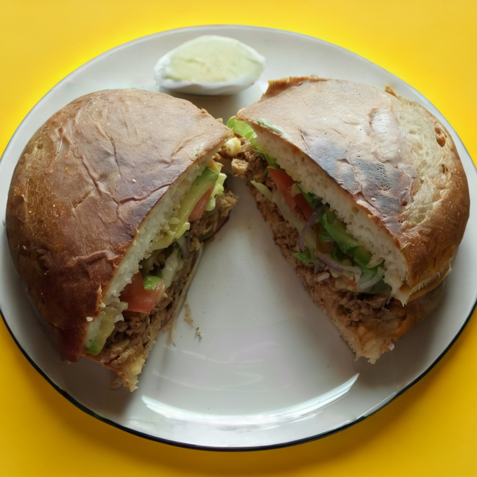 Telera con carne deshebrada, tomate, lechuga, aguacate, crema, salsa, jamón y queso amarillo derretido.