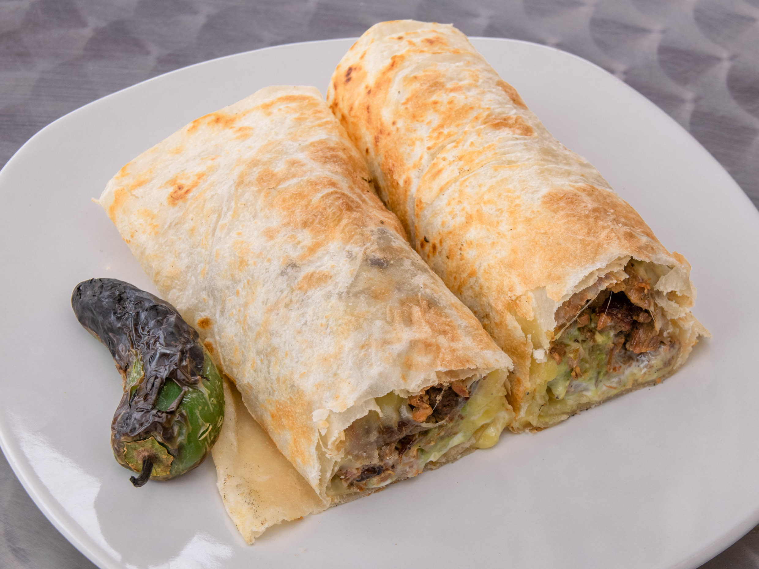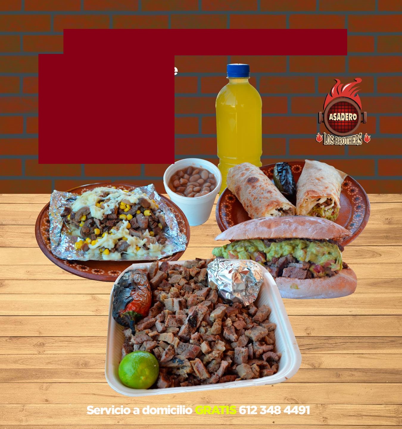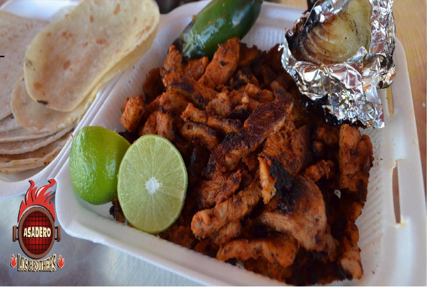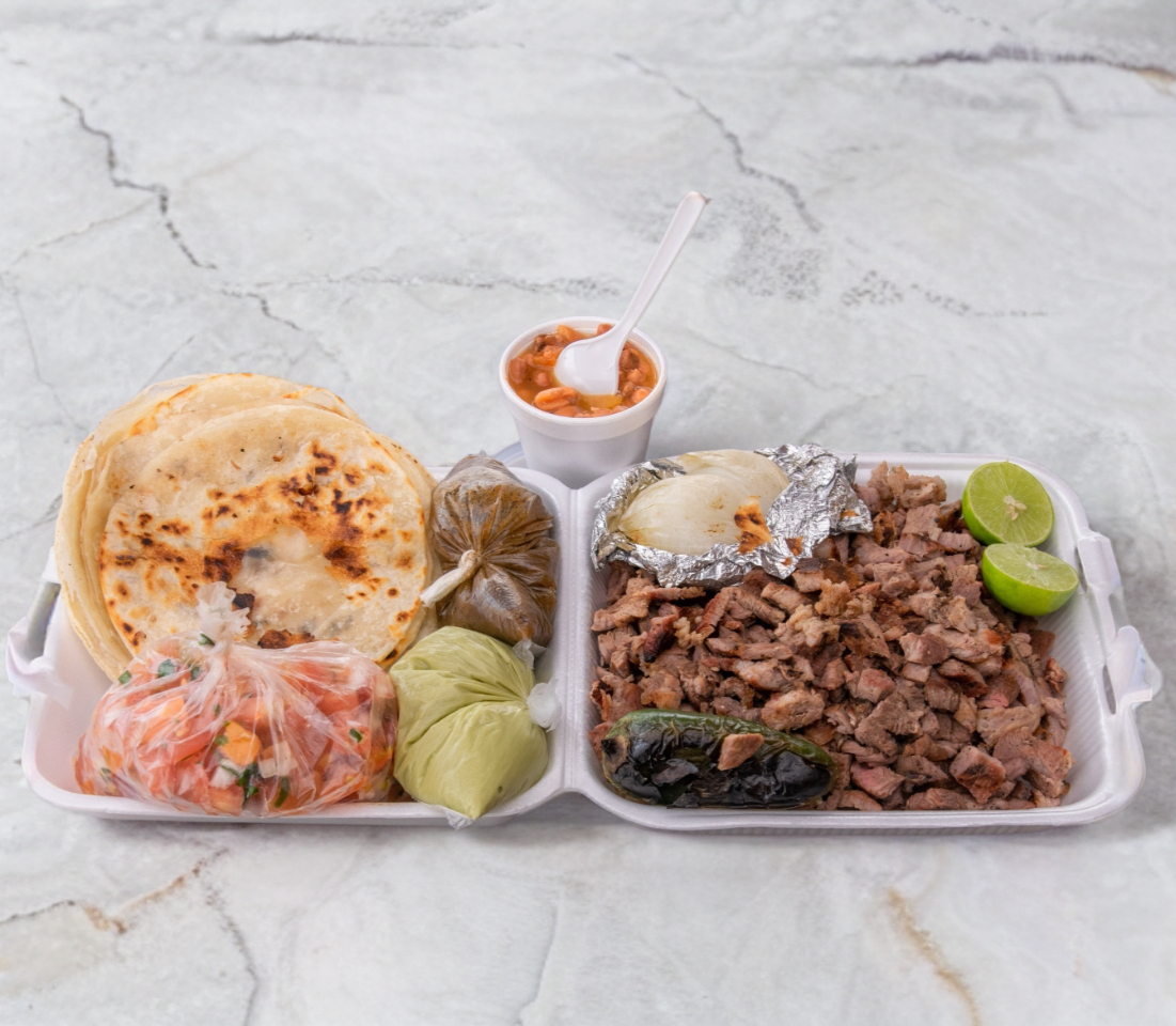 mitad carne y adobada, oncluye tortillas, salsa