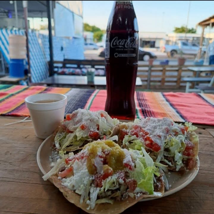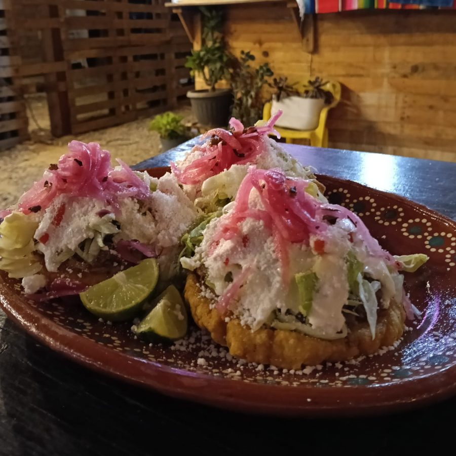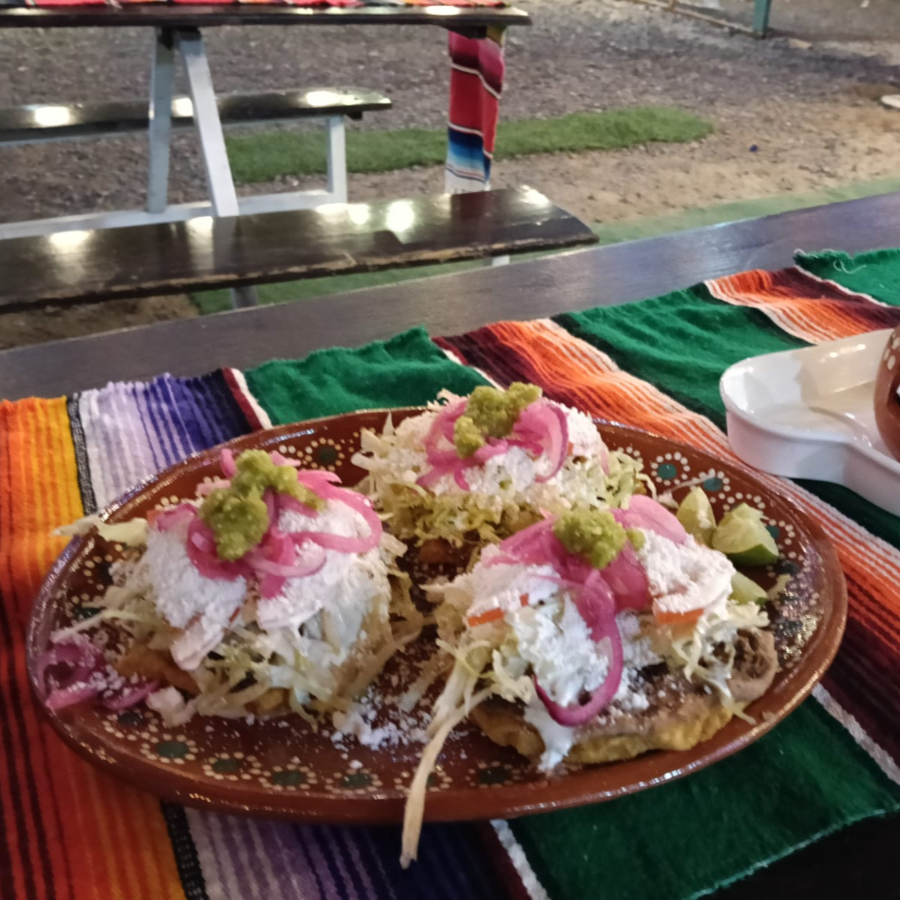 SOPES DE DESHEBRADA DE RES, CON FRIJOL CON ASIENTOS, LECHUGA, TOMATE, ADEREZO Y QUESO COTIJA