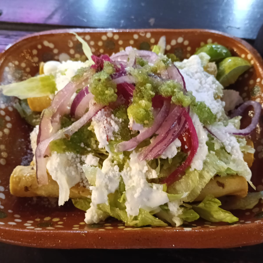 FLAUTAS DE DESHEBRADA DE RES, CON LECHUGA, TOMATE, ADEREZO Y QUESO COTIJA
