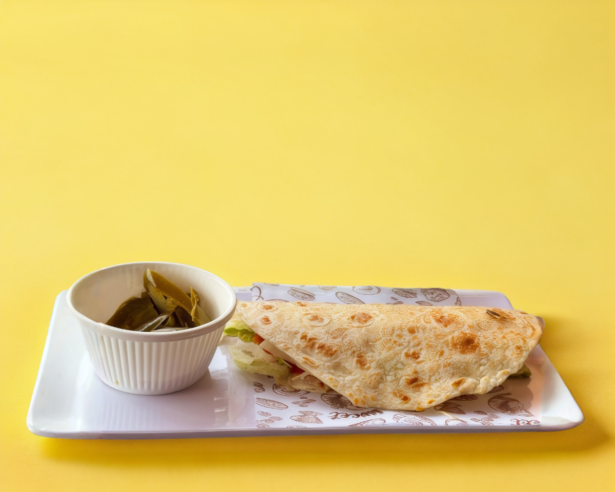Tortilla de harina, pollo a la plancha y queso mozzarella.