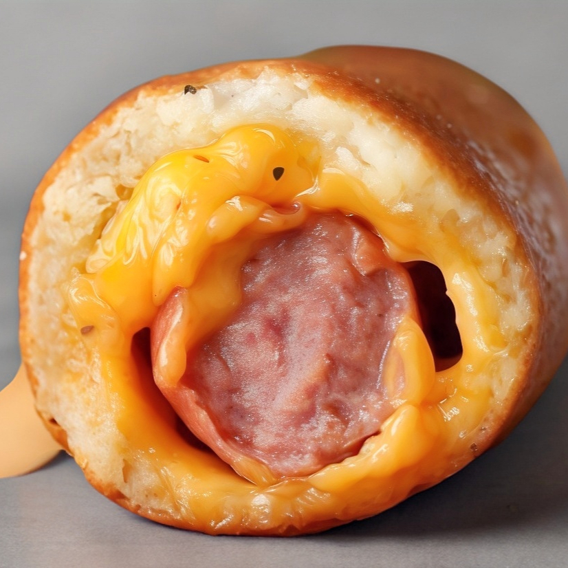 Banderilla especial de salchicha con tocino y trozos de queso cheddar