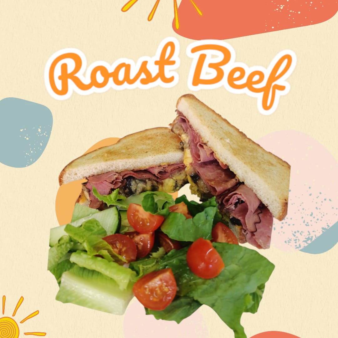 Pan blanco, carne roast beef, queso manchego, queso americano, champiñones naturales salteados. Acompañado de una guarnición de ensalada.