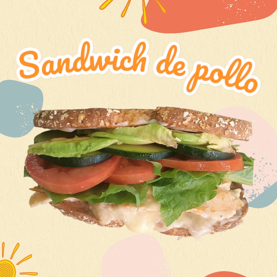 Pan integral, pechuga de pollo a la plancha, queso manchego, lechuga, tomate, pepino y aguacate.