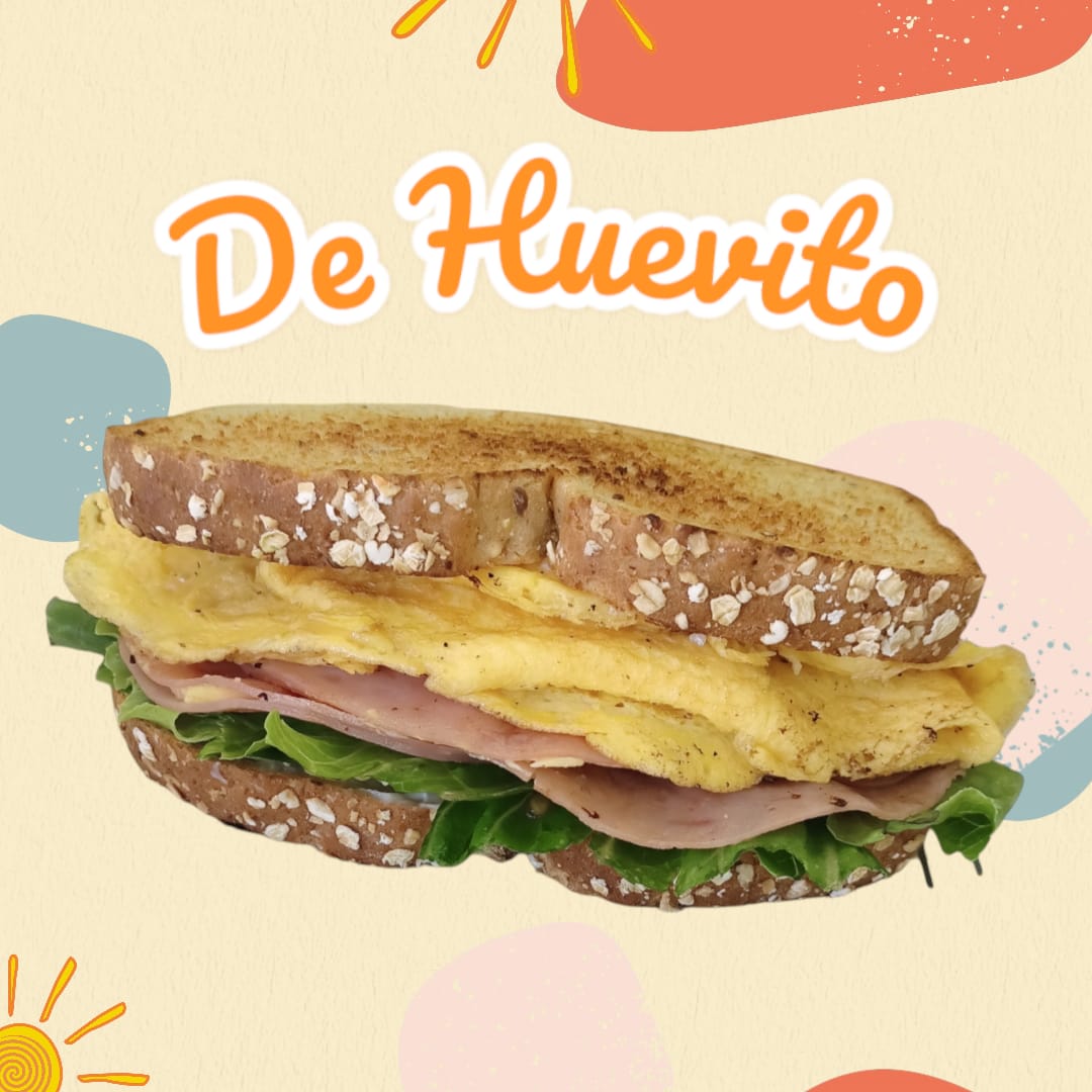 Pan integral, 1 rebanada de jamón de pavo, 2 piezas de huevo torta, lechuga, pepino y aguacate.