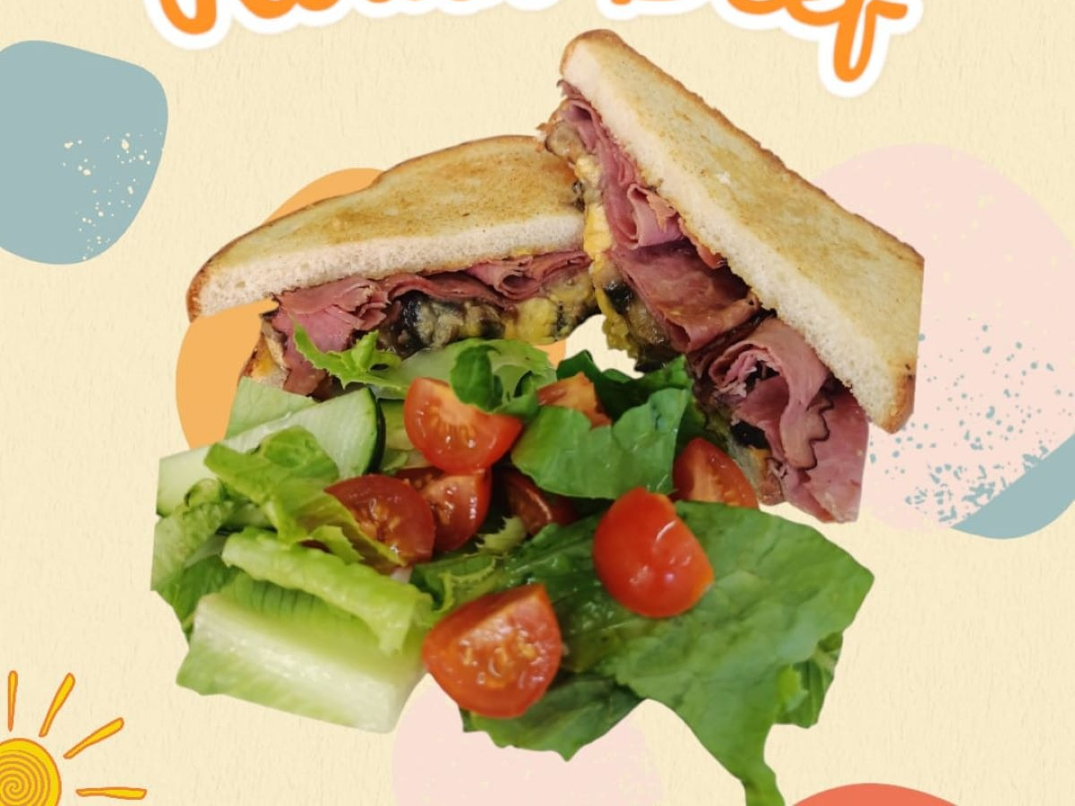 Pan blanco, carne roast beef, queso manchego, queso americano, champiñones naturales salteados. Acompañado de una guarnición de ensalada y té helado.