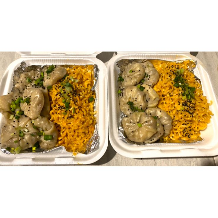 DUMPLINGS RELLENOS DE CERDO , VEGETALES Y QUESO CREMA MAS RAMEN DE QUESO PICANTE