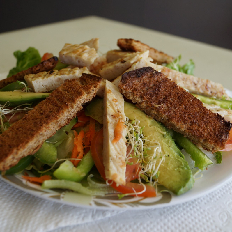 Pechuga de pollo, Lechugas Mixtas, zanahoria, pepino, aguacate, tomate, tiras de pan tostado, aparte aderezo.