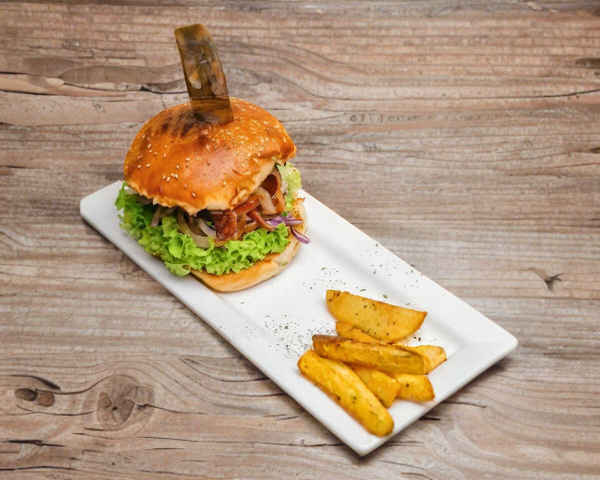 Carne sirloin, queso gouda, servido con albahaca fresca, tocino, cerezas, piña y lechuga mixtas acompañada de papas romero.