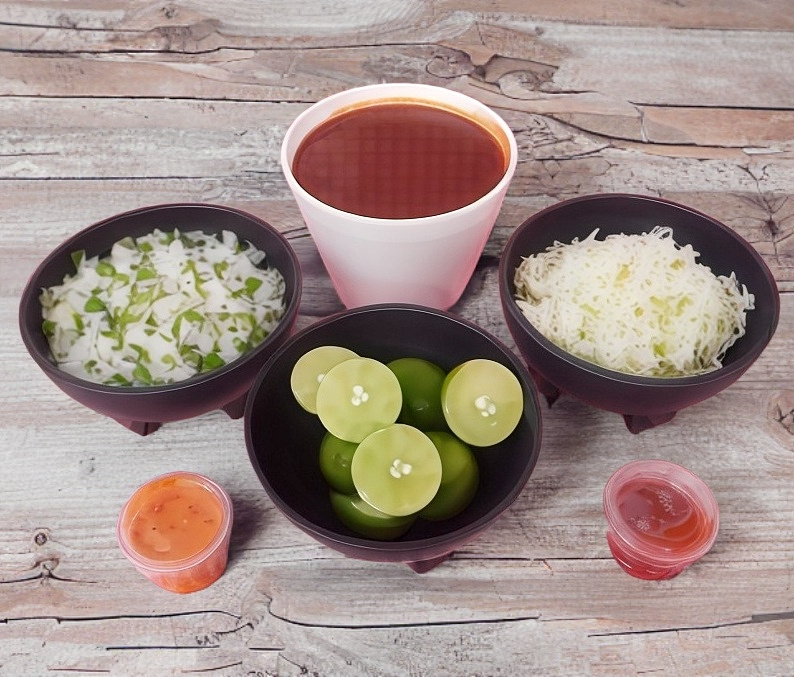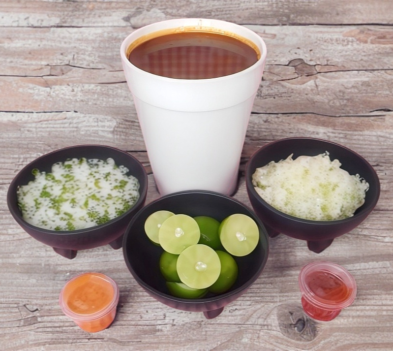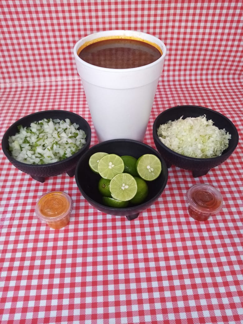 Birria de res (1/2 Litro), incluye cebolla, cilantro, repollo, salsa, limón y tortillas.