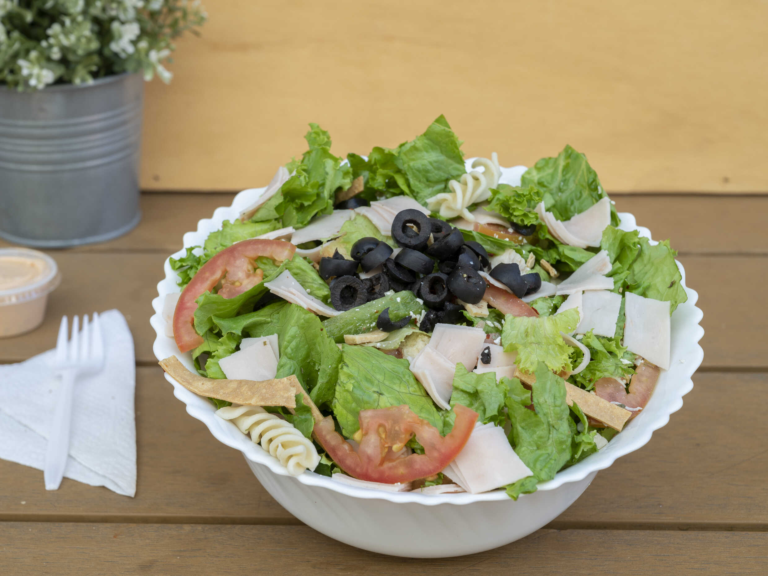 120 gr de proteína. Lechuga, tómate, pepino, pimiento verde, elote, queso panela, aceituna negra.