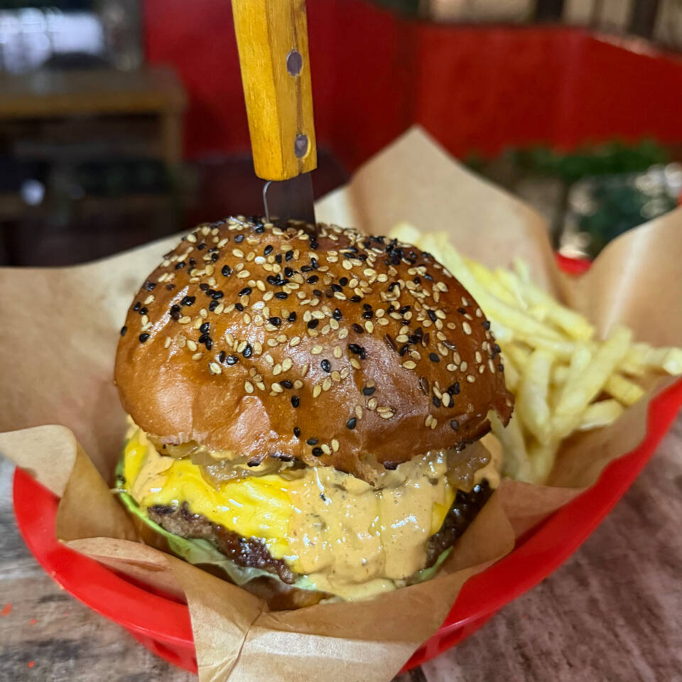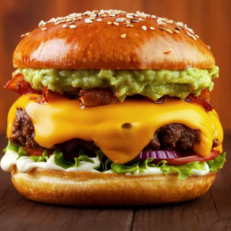 1/2 libra de carne angus, queso americano, tocino, guacamole, jalapeños, cebolla caramelizada, aderezo especial, acompañada de papas a la francesa