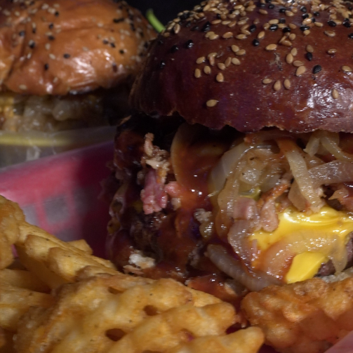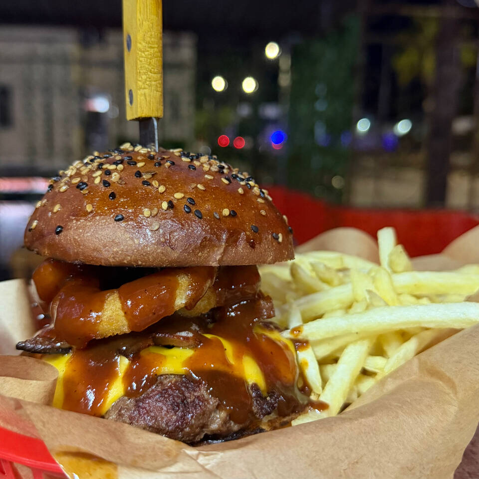 1/2 libra de carne angus, queso americano, pork belly, aros de cebolla y aderezo especial, acompañada de papas francesas