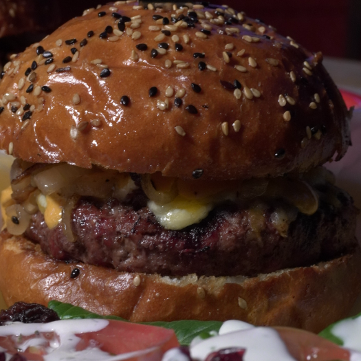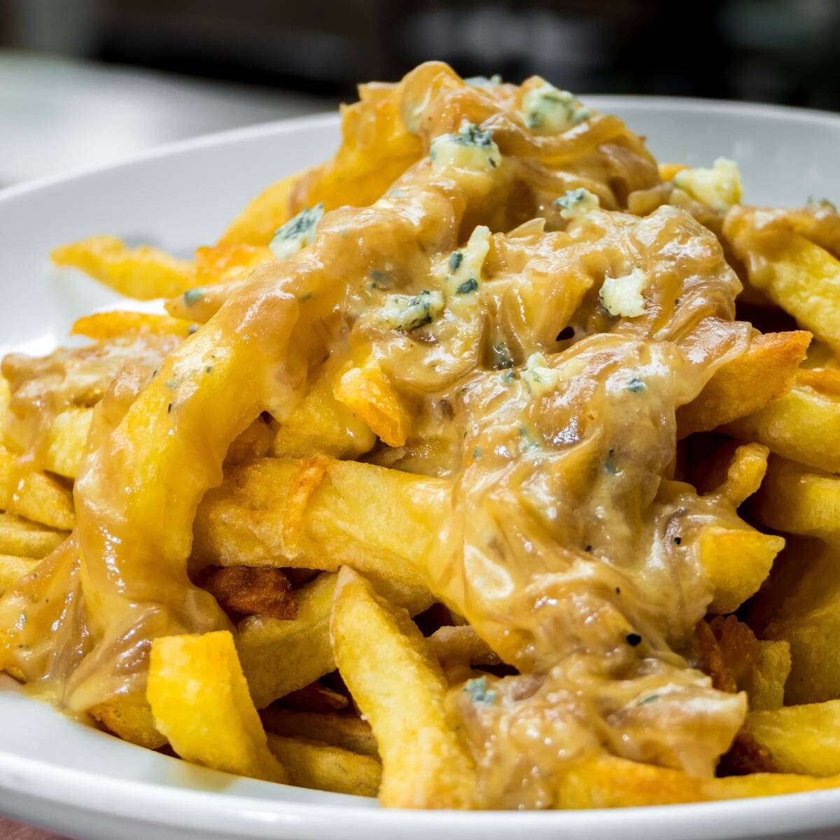 1/2 libra de carne angus, bañada en 4 quesos, cebolla caramelizada y aderezo especial, acompañado de papas a la francesa
