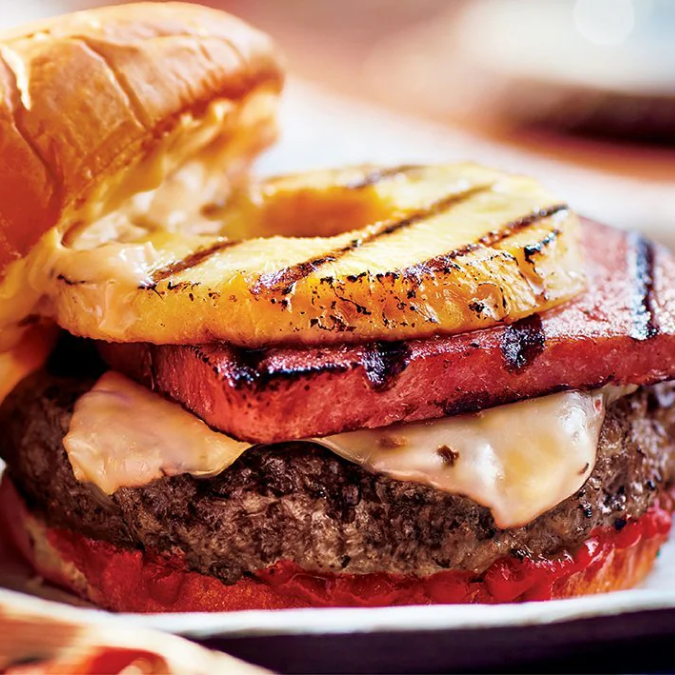 1/2 libra de carne angus, queso Oaxaca, piña asada, jamón asado, hojas de temporada, aderezo especial, acompañada de papas a la francesa