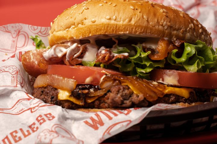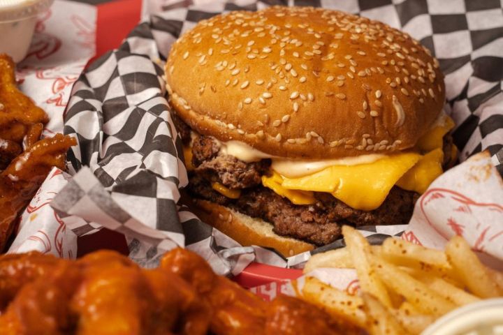 Hamburguesa de su eleccion, media orden de boneless, acompañados de papas a la francesa y aderezo ranch de la casa.